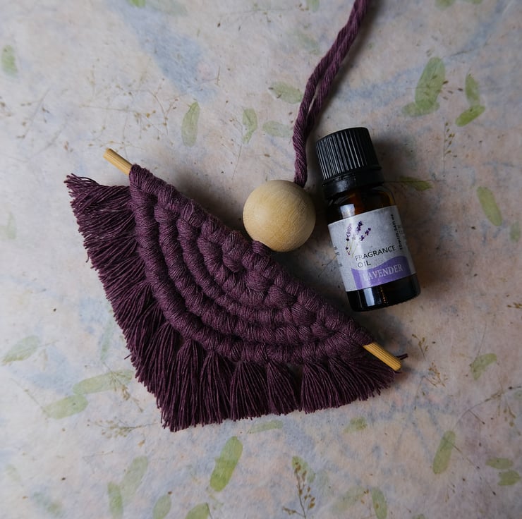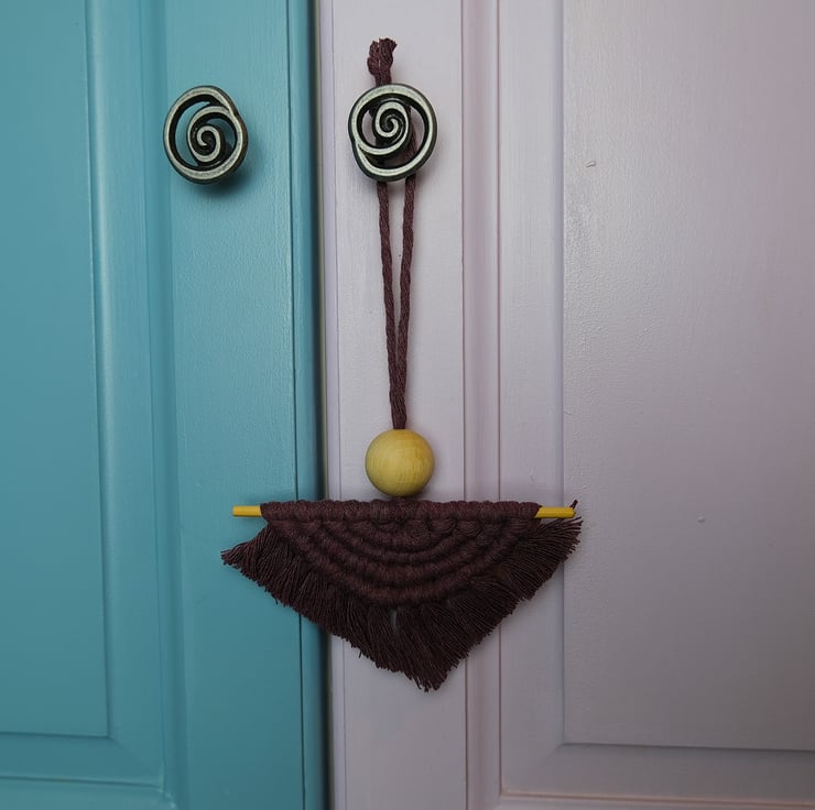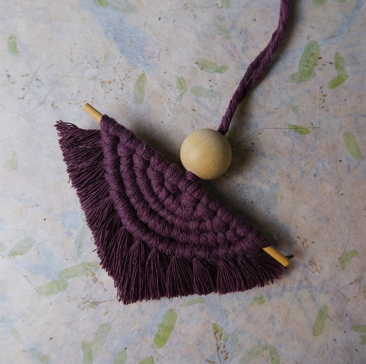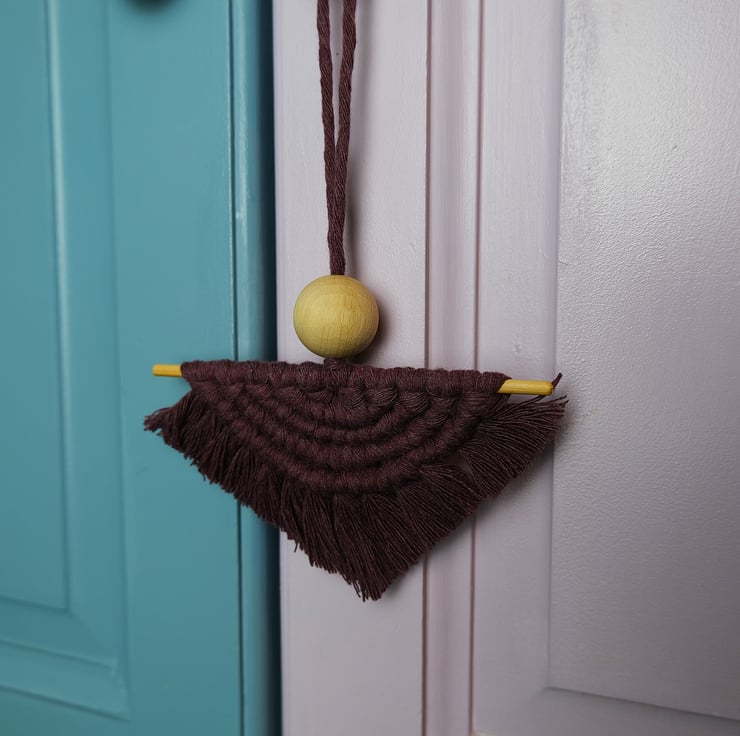 This half moon macramé hanging decoration comes in a deep purple colour.