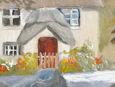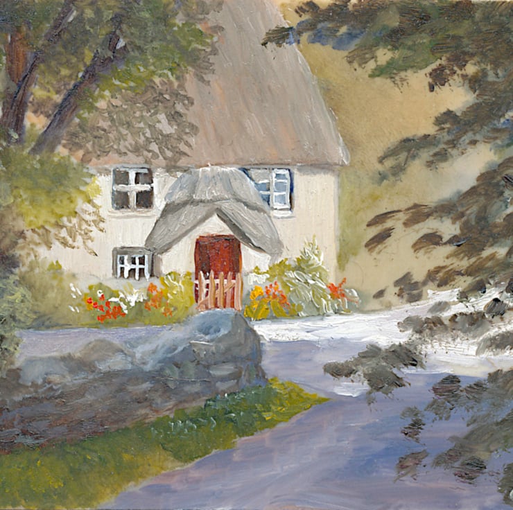 A thatched cottage with pretty flowers and a red door took my attention while on holiday. Unable to paint it unless I sat in the middle of the road, I took a photo and a quick pencil sketch, to be used later for a small-scale oil painting. The original has now been sold.