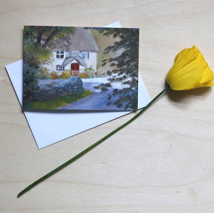 The subject is a little thatched Devon cottage. The original painting was the same size as the card.