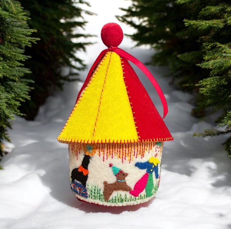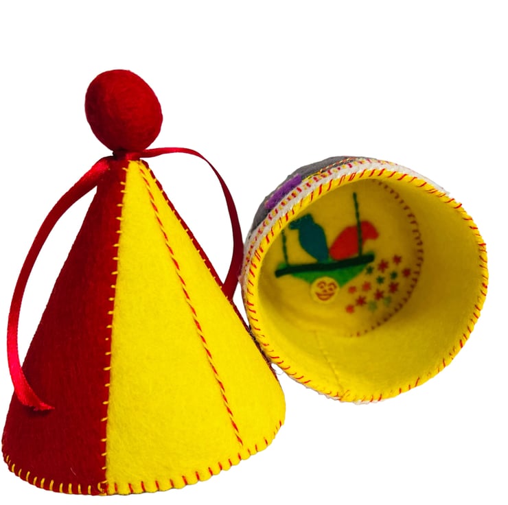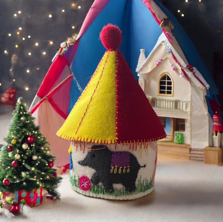 I am taking orders for this bright and beautiful circus pot. I use the original 1970's fuzzy felt pieces to applique onto 100% heirloom quality wool felt. The pot and lid are fully lined and there is a suprise character laughing at you when you take the lid off !