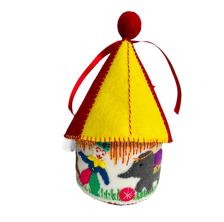 Made in traditional circus colours ,this pot features an embroidered elephant, a clown, a cute dog, and seal on a podium and a dancer.