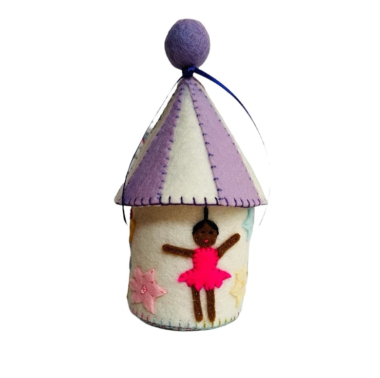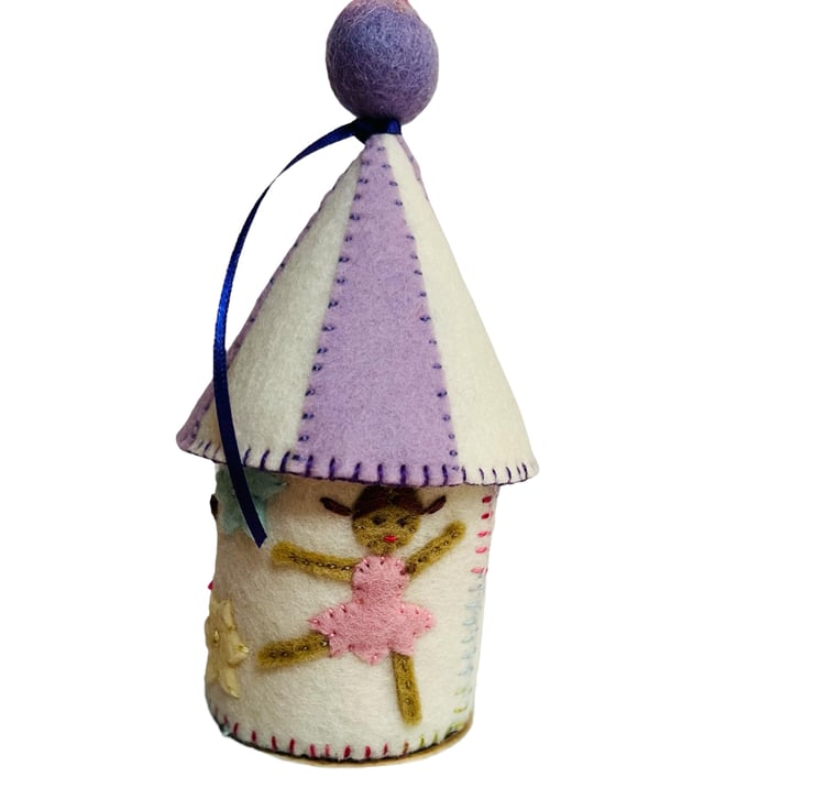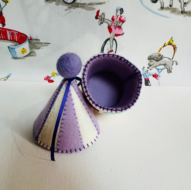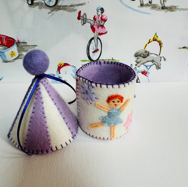 A perfect Christmas gift for a ballet dancer ! This OOAK felt Ballerina Pot is inspired by the Fuzzy Felt dancers of the 1970's. I have decorated the storage pot with some original Fuzzy Felt characters. The three different dancers are sewn onto 100% wool, heritage quality felt. The pot is fully lined with lilac wool felt and the lined stripey lid is finished off with a wool felt ball and purple ribbon.
