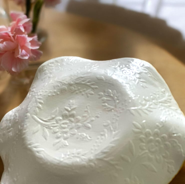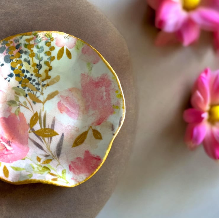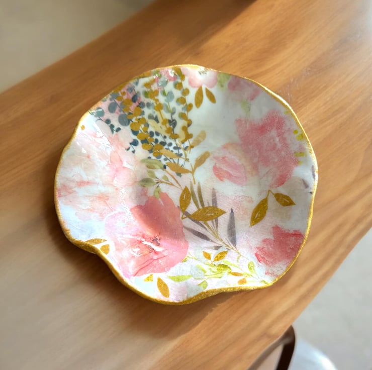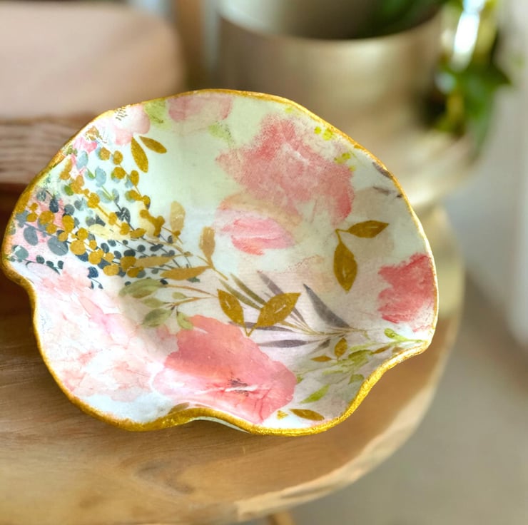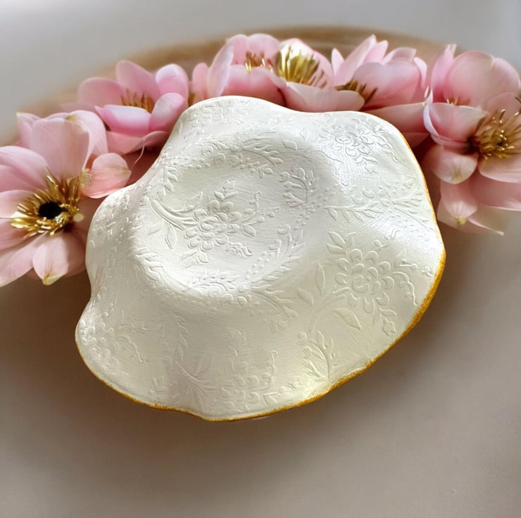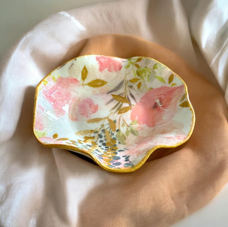 The dish takes 7 days to create as each process needs to be dry. It has been handmade using DAS clay. The reverse of the dish has a subtle embossed design. Using the art of Decoupage the luxury tissue paper was applied. The rim of the dish was coloured using a gold acrylic paint. A high gloss glaze really completes the look.