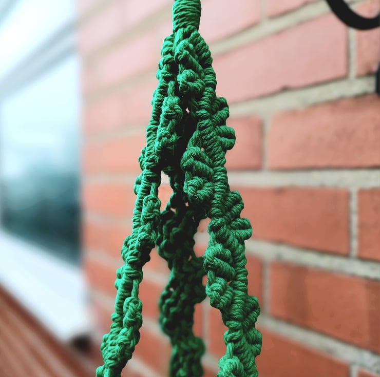This hanger is made from 3mm thick cotton cord. It is approximately 80cm long (60 excluding tassel). It fits a variety of pot sizes, but will look best with pots in 10-15cm range.