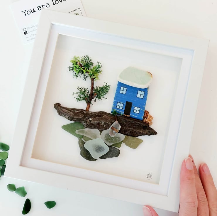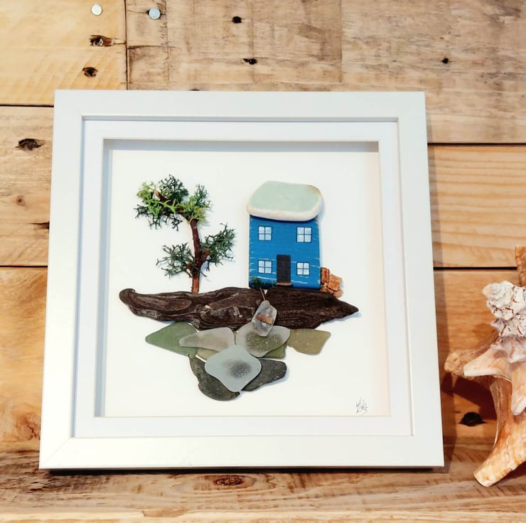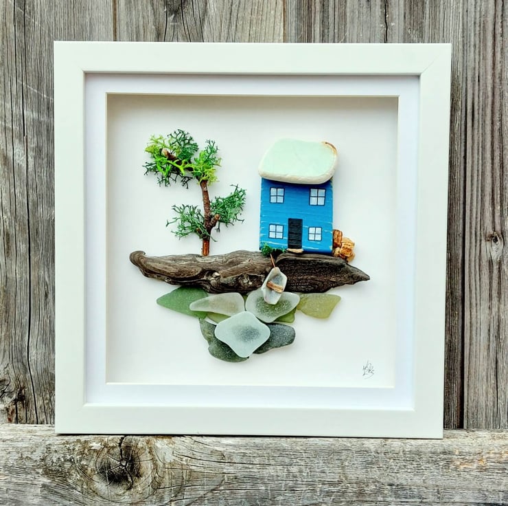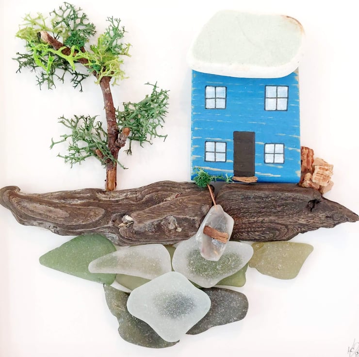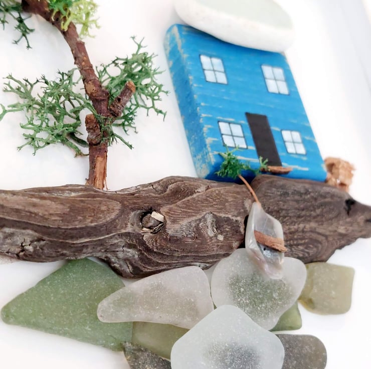 This charming, eco-friendly artwork features a whimsical, hand-painted miniature blue cottage sitting on a piece of driftwood with a sea glass ocean beneath. The cottage is made from reclaimed driftwood collected during my coastal adventures and intricately painted with acrylics. This unique, one-of-a-kind piece is set in a white box frame, with a hook on the reverse, ready to hang on your wall.
