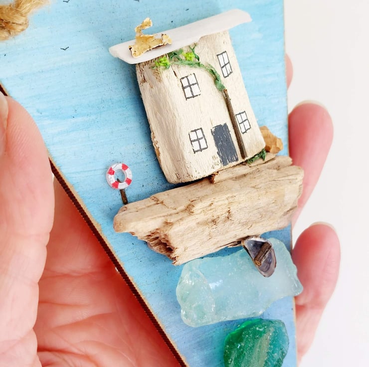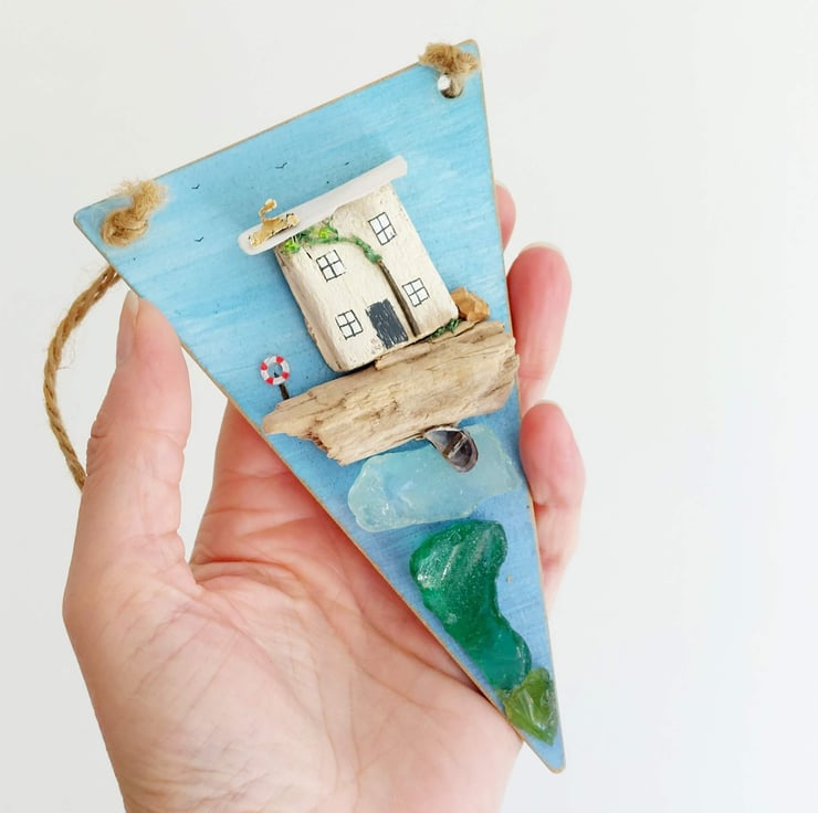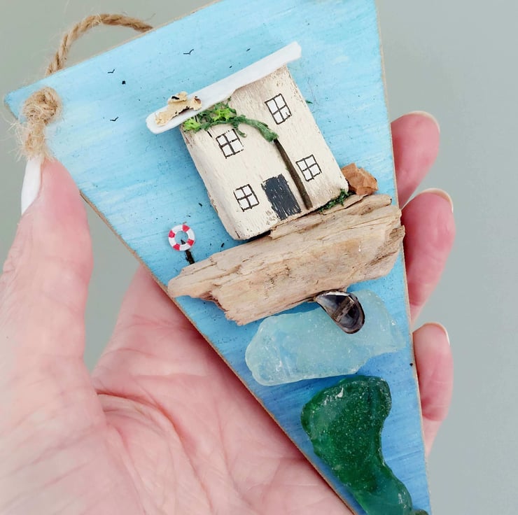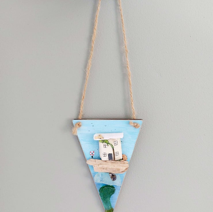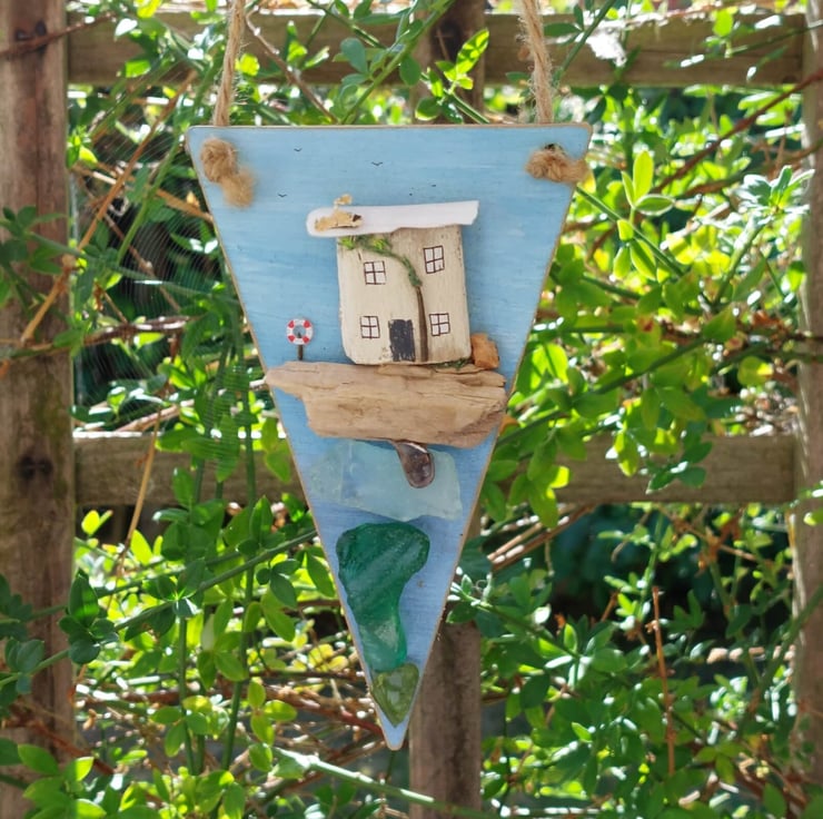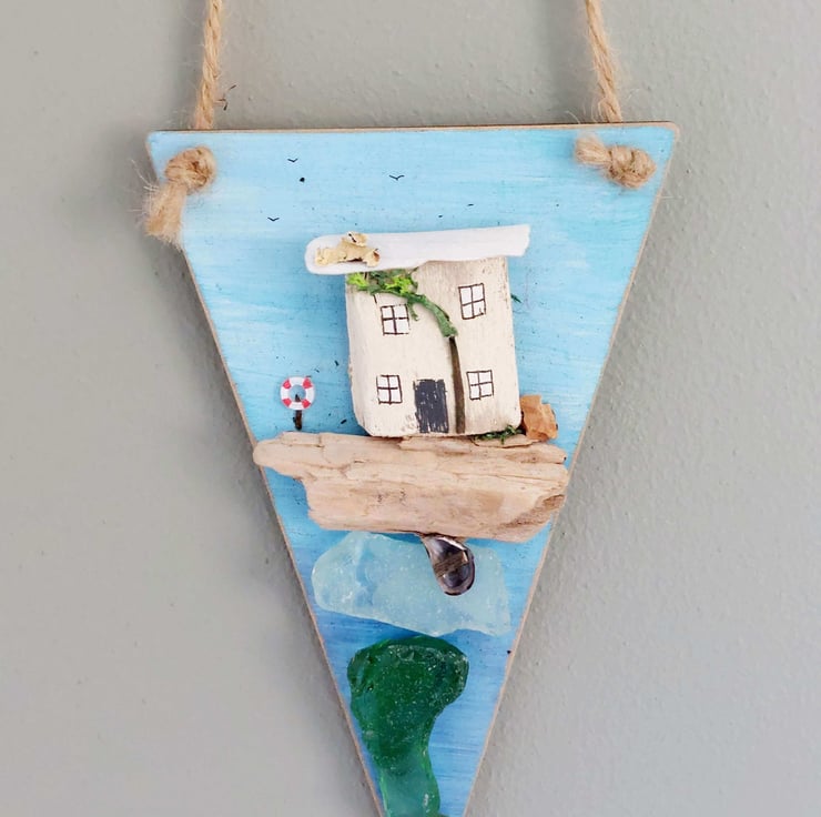 This sun kissed coastal cottage on a bunting-shaped backing, features driftwood and sea glass collected on my beachy travels. It has been lovingly crafted and inspired by my love of all things seaside - I hope it makes you smile! This piece, with its laid back, sun bleached vibe, will make a wonderful gift for someone who loves coastal themed decor.