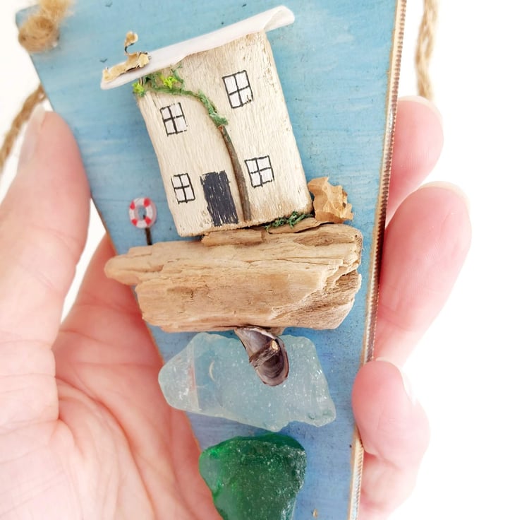 Whilst on a trip to Conwy beach in North Wales, topping up my already vast sea glass collection, I was inspired by the cute little coastal cottages, as well as the 'smallest house'. I've used the aqua coloured, chunky pieces that I found there to create this gorgeous decoration, perfect for coastal themed interiors.