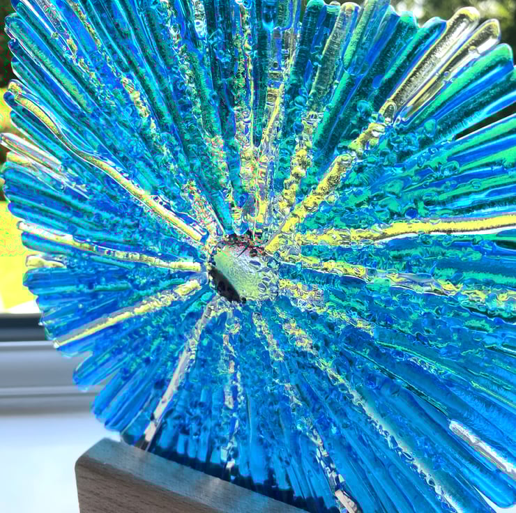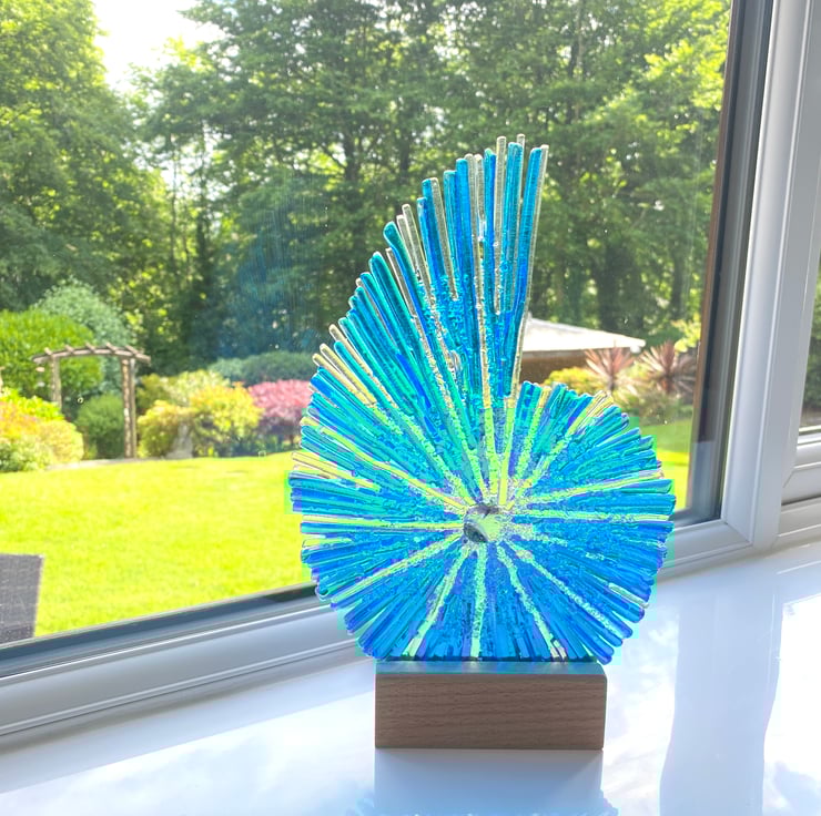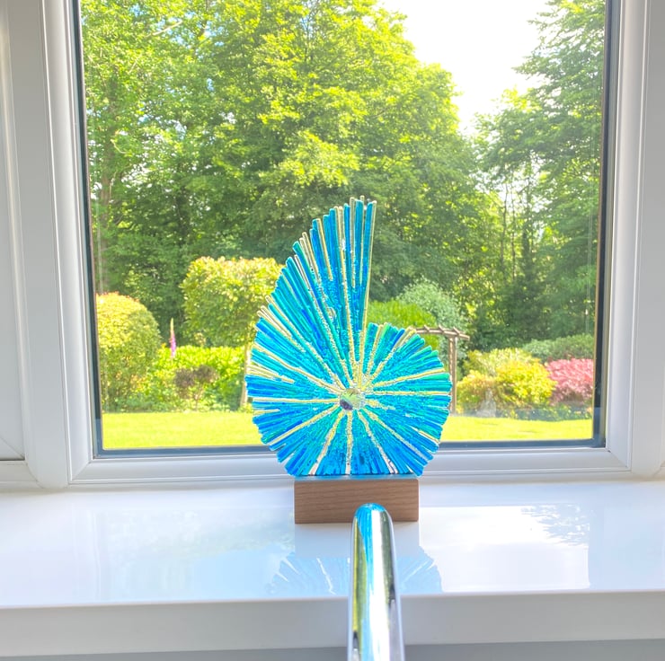 Gorgeous caribean blue fused glass ammonite sculpture . This hand crafted glass ammonite is created over two fused glass firings and catches the light beautifully . The ammonite simply slots into the wood base . The oak base also has a slot for a candle should you wish to back light for evening wow . The glass sculpture stands at approximately 11.5 inches .