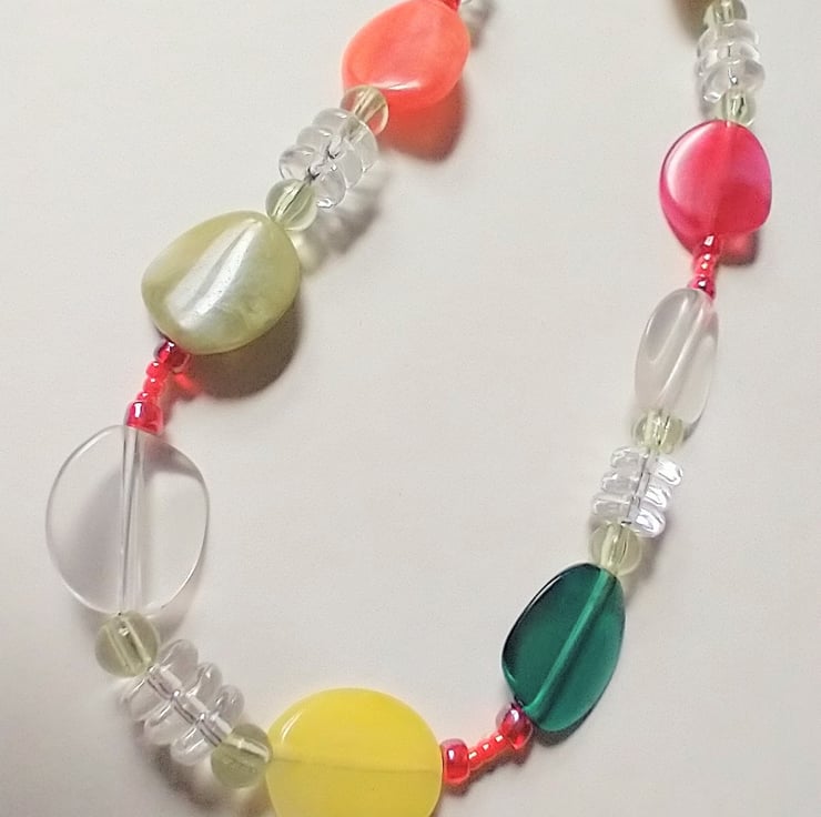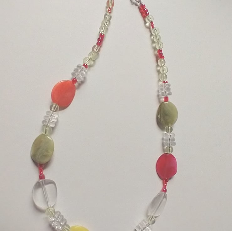 Pretty and eye-catching necklace featuring up-cycled beads in fruity pastel shades of peach, lemon and green. Combined with crystal clear rondelle beads makes a unique design for summer. A shorter length to sit higher on the neckline.