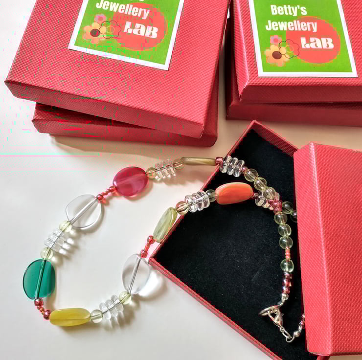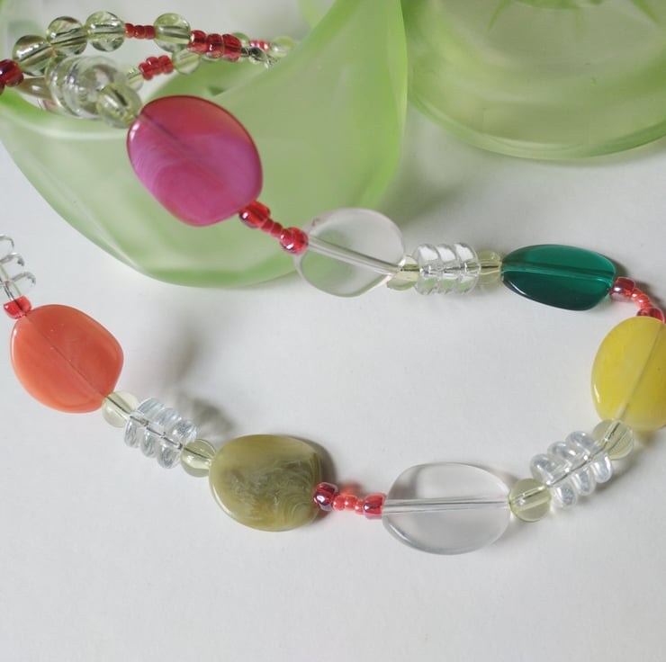 I bought a small bundle of colourful flat oval beads and was looking for a way to showcase them. I decided combining them with the clear rondelles made a fresh design but with a retro flavour.