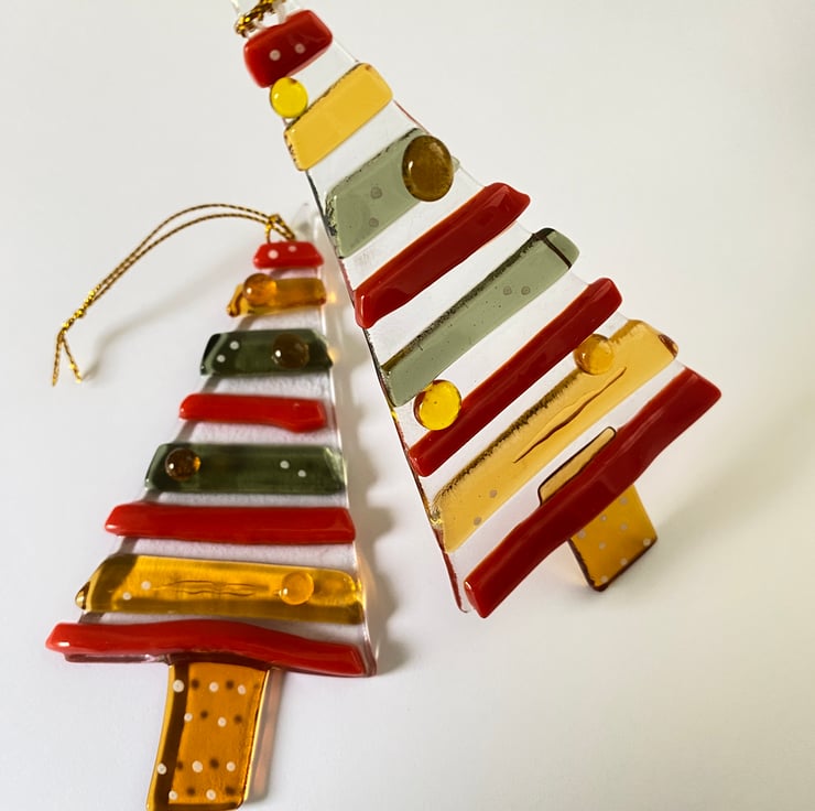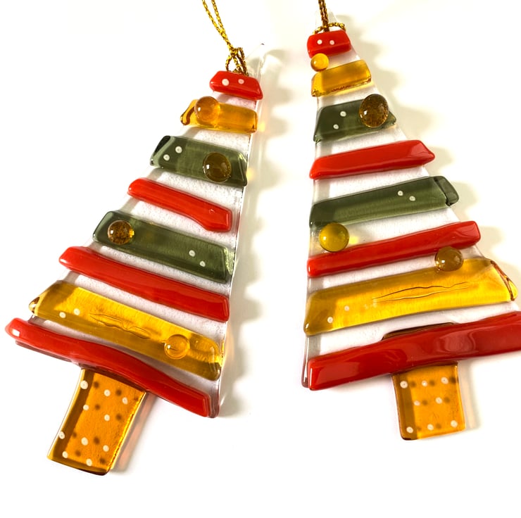 Fused glass tree with gold, red and green fused glass stripes. These gorgeous fused glass trees are made using strips of coloured glass - also had glass bead baubles on them . Perfect addition to your tree