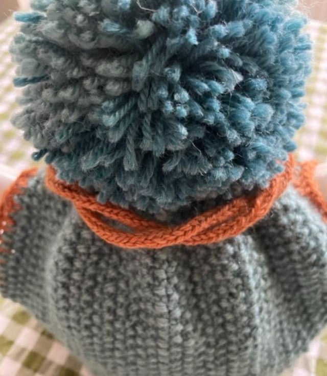 Knitted in soft polymide aran weight yarn in a muted teal-ish colour way. (which is a difficult colour to describe actually,) it has a rather retro look, knitted in a nice textural moss stitch.