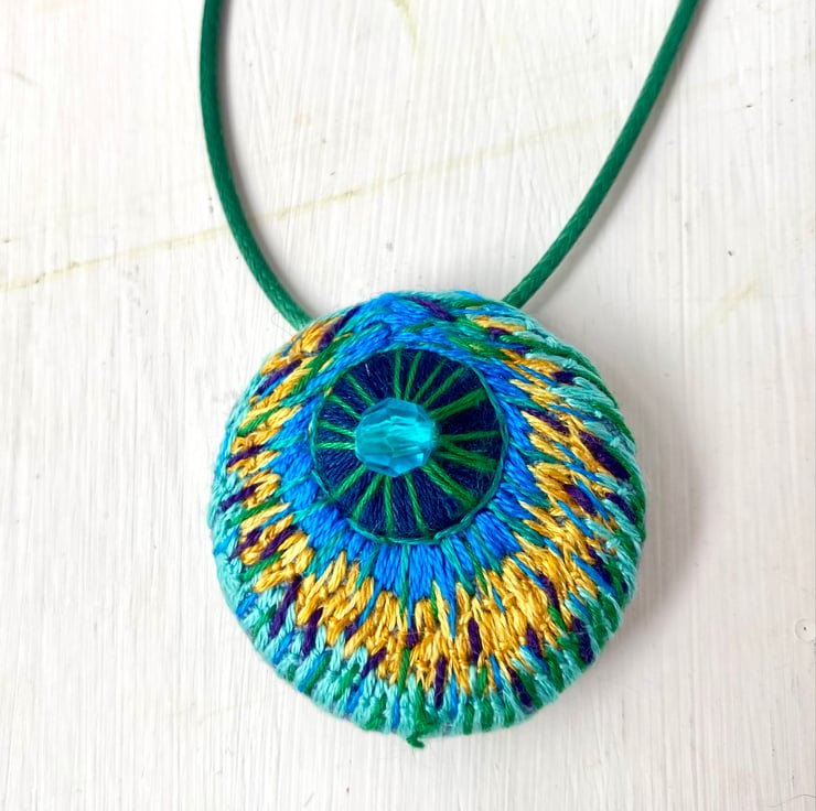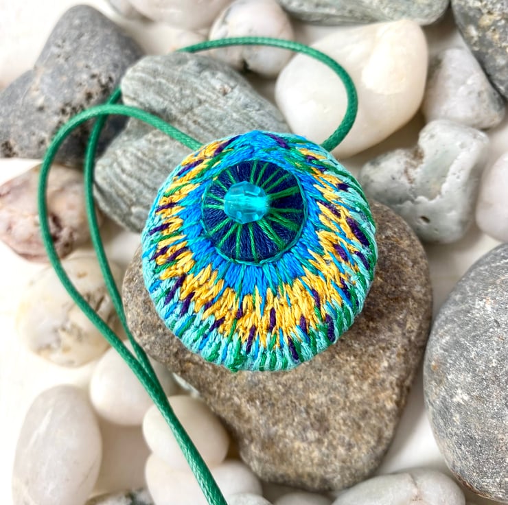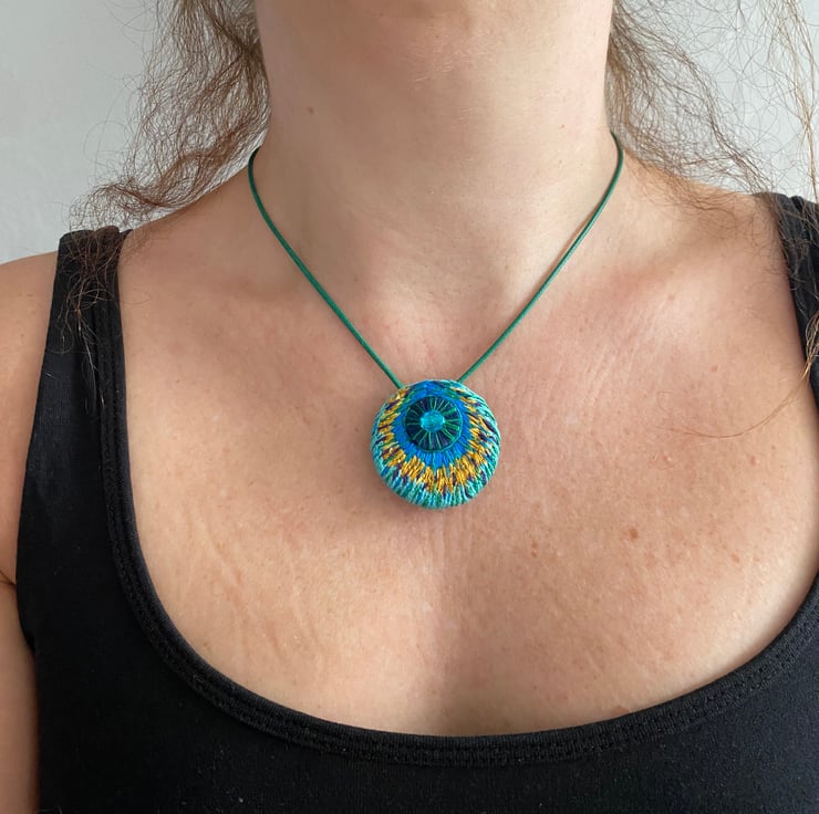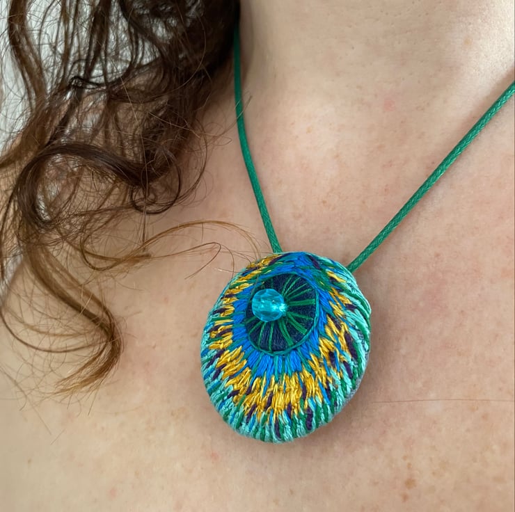 Hanging on a 17 inch adjustable cord with a clasp fastening. It is completely hand stitched and measures 1.5 inches in diameter.