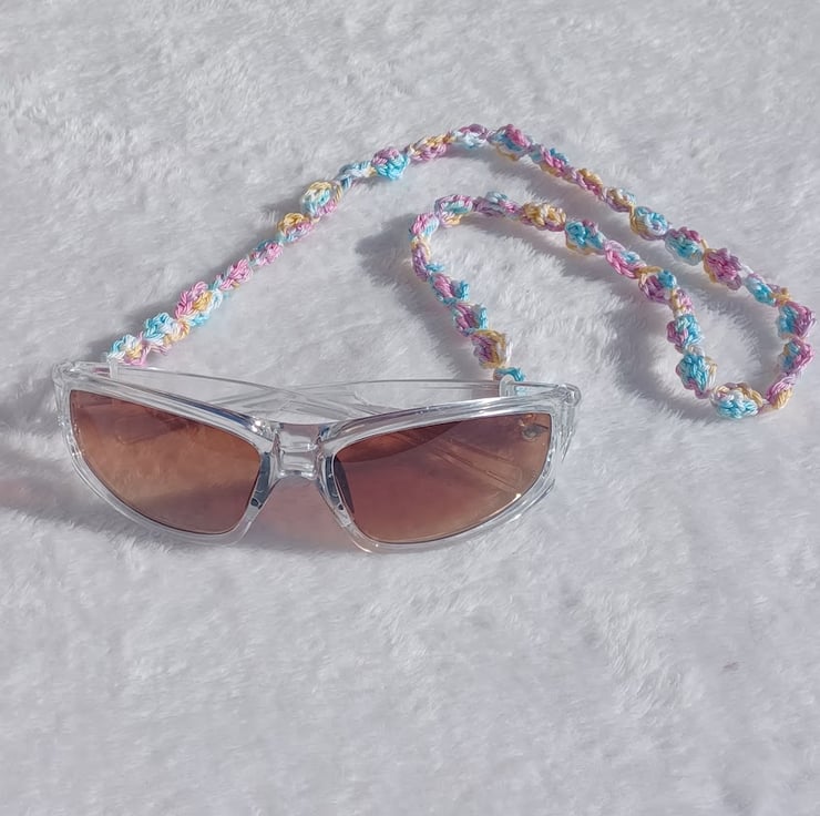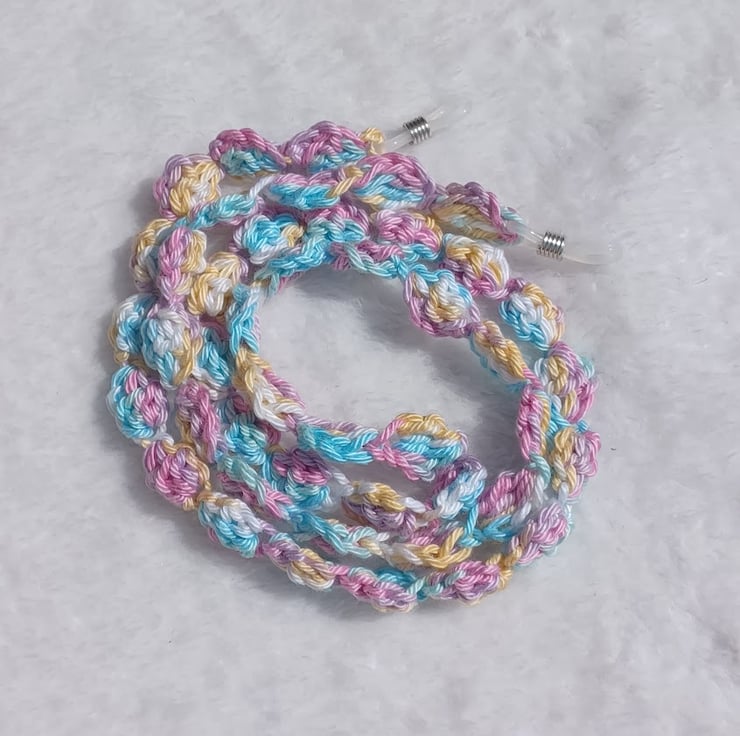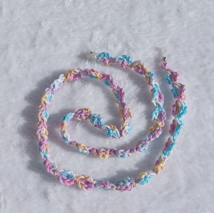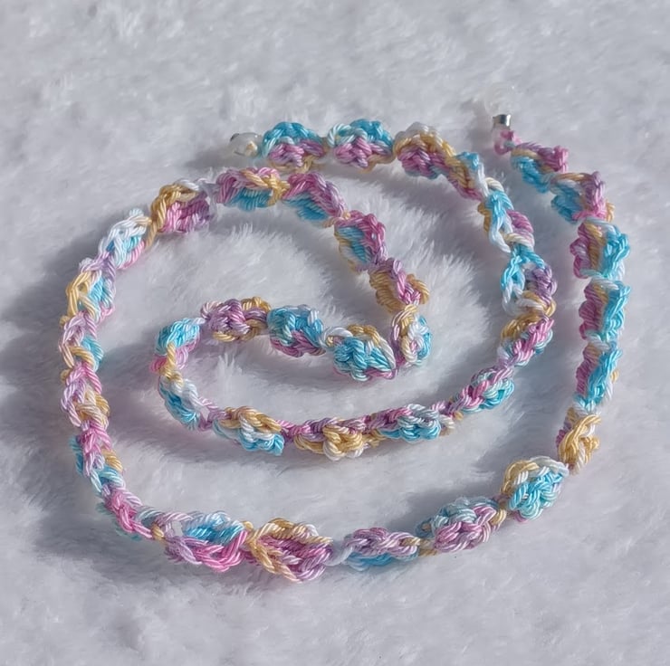 Handmade glasses chain made from mixed colours cotton yarn (blue, white, pink, purple, yellow) with adjustable silicone end loop white (clear) colour