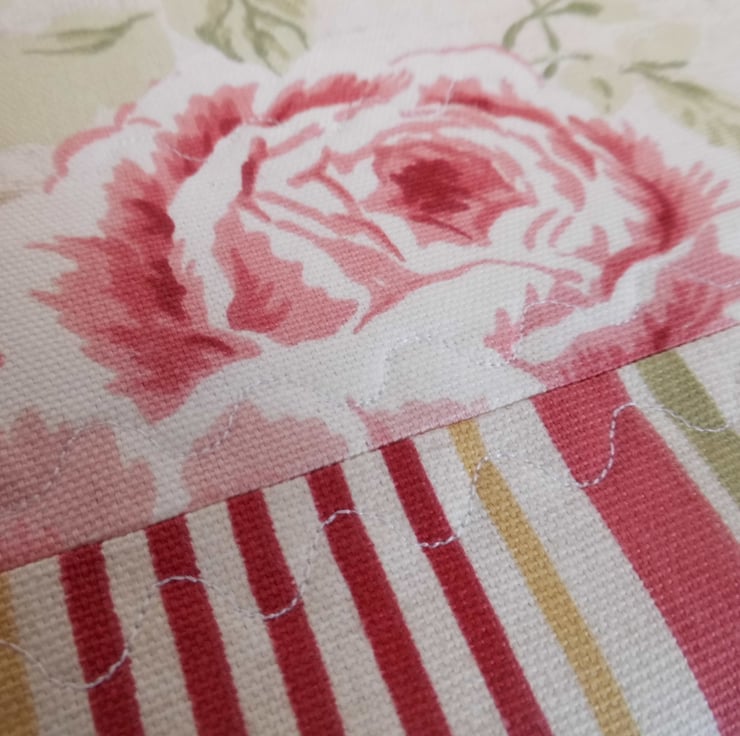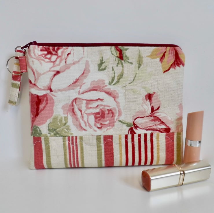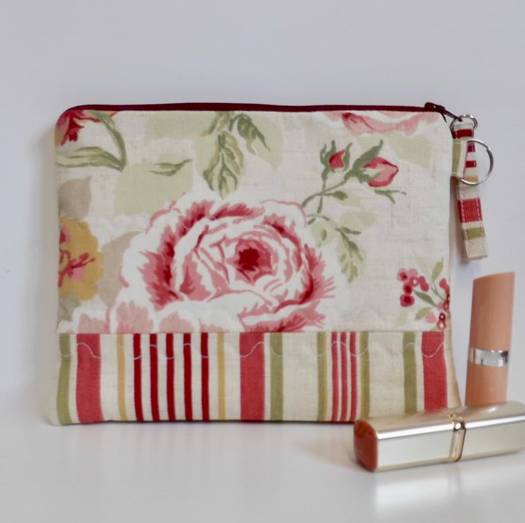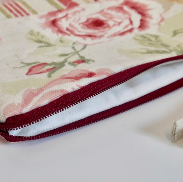 This purse is made of a furnishing weight floral fabric with a red/pink and green striped fabric sewn along the bottom. I backed this fabric with fusible fleece and then machine stitched across each side with three rows of wave stitch to achieve a lightly quilted effect. It is lined with plain white poly/cotton.
