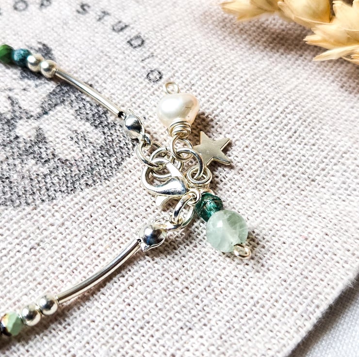 This bracelet features a lovely hand-carved mother of pearl crescent moon charm, a hand-wrapped freshwater pearl charm, and a silver star charm for some celestial sparkle!