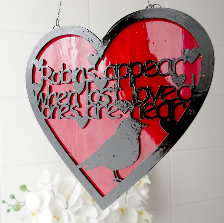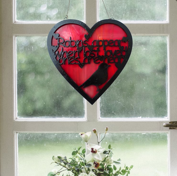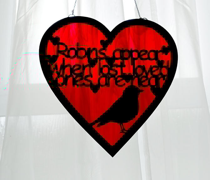 Large scarlet stained glass heart with the legend "Robins appear when lost loved ones are near" in mdf painted in matt black.