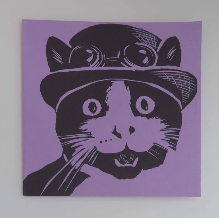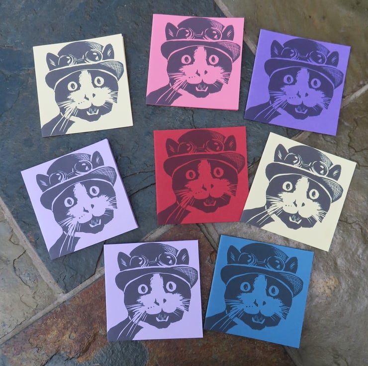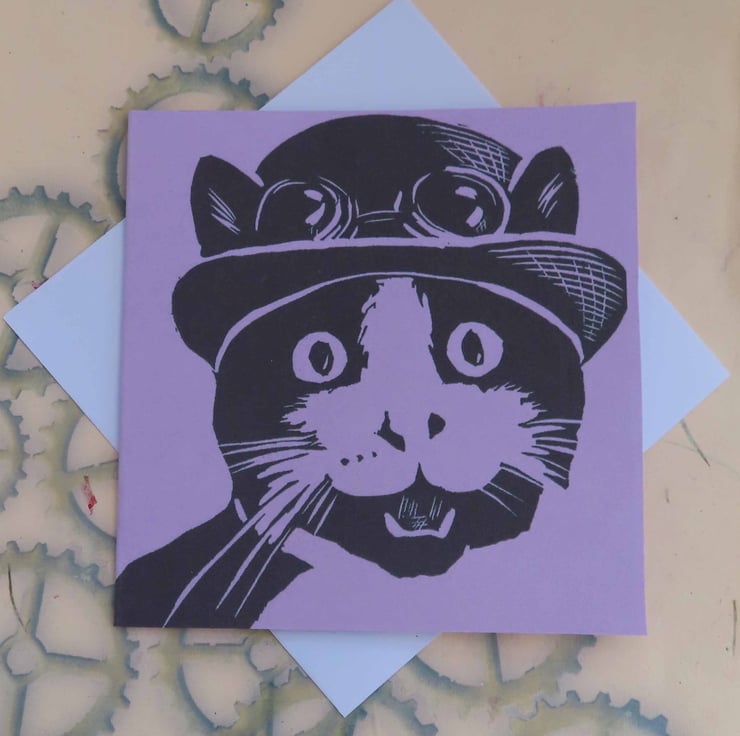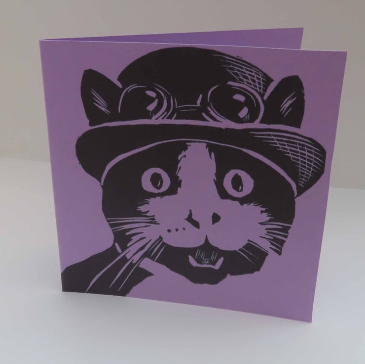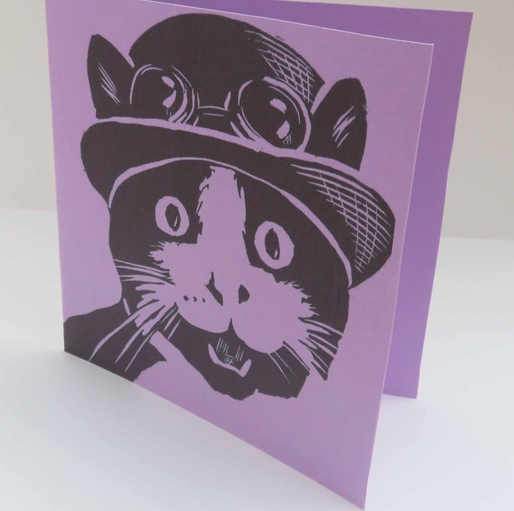 Blank greeting card reproduced from my original lino cut print Happy Kitty
