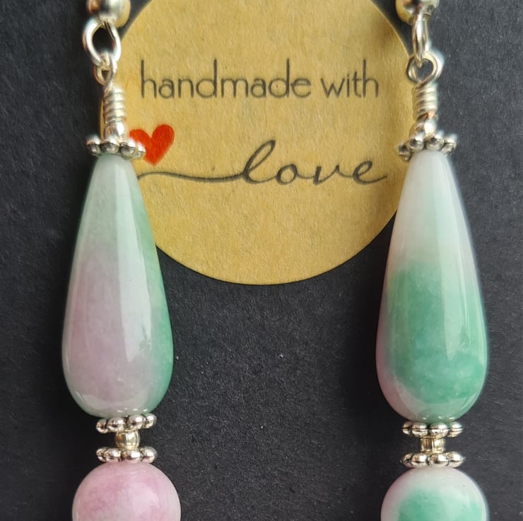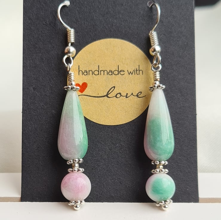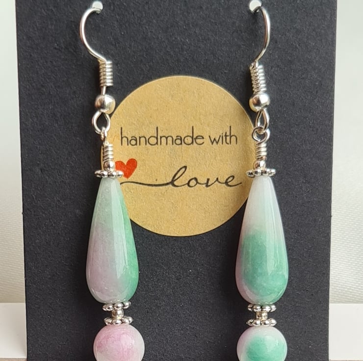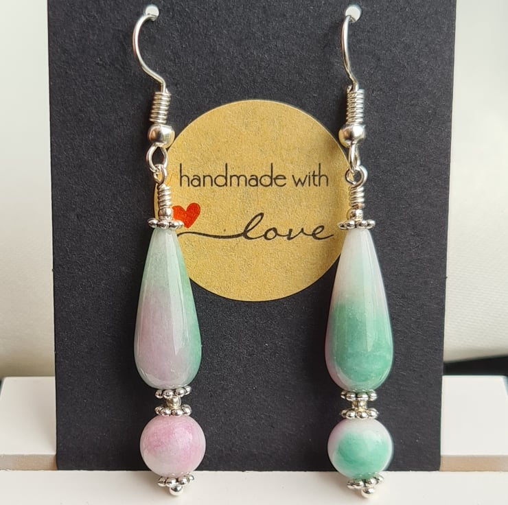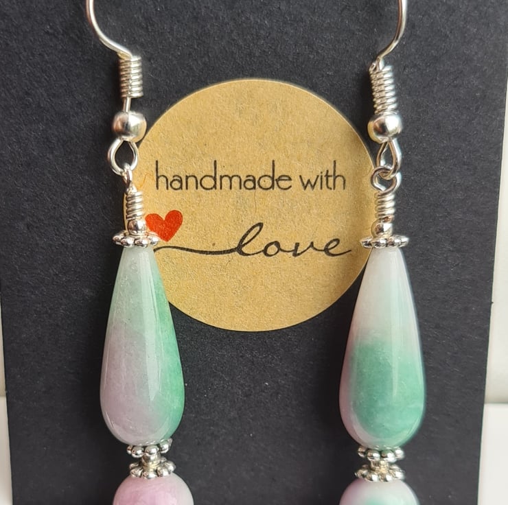 Lovely teardrop/round Watermelon Gemstone Bead Earrings. A gorgeous pair of dangly earrings in pale Lilac and Green. Great as an unusual gift.
