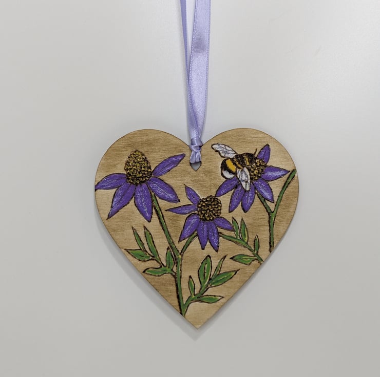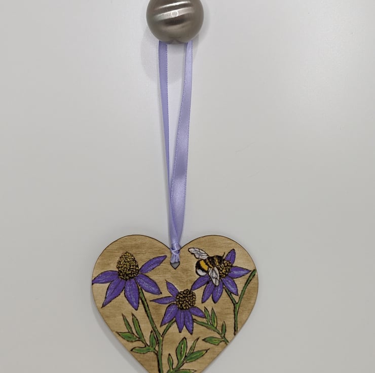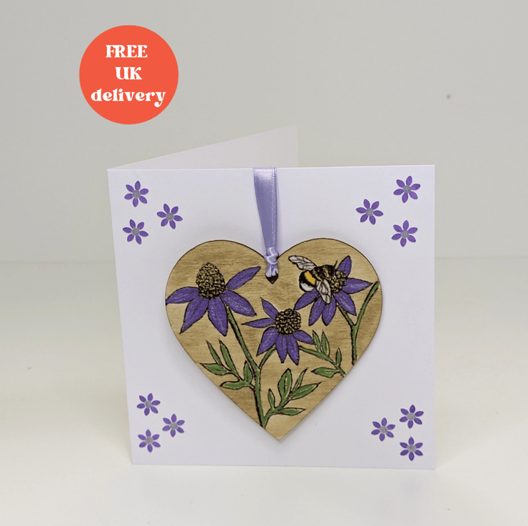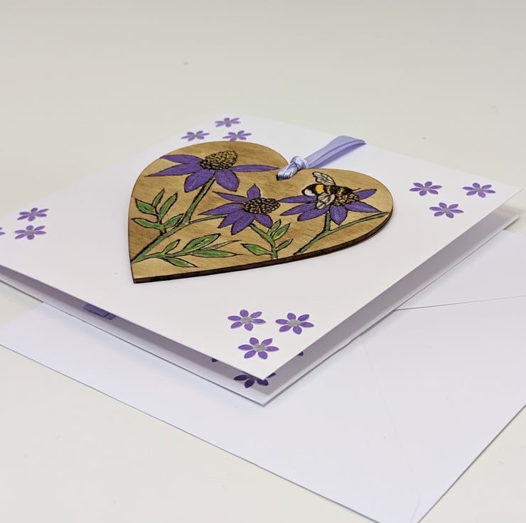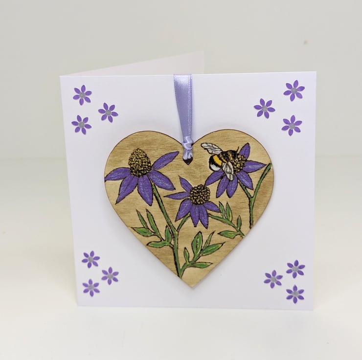Handmade greetings card with removable pretty floral wooden heart keepsake featuring purple flowers and a bumblebee. This square white card has been decorated with small purple flowers with silver coloured centres and topped with the wooden heart. The decorative wooden heart has been lovingly handburnt, using the art of pyrography, with the flowers and a bee which have been coloured using acrylics. There is a slight shimmer to the bee's wings and the flower petals. The plywood heart can be easily detached and comes ready to hang from lilac satin ribbon and would look lovely hung in a window or from a knob or handle.