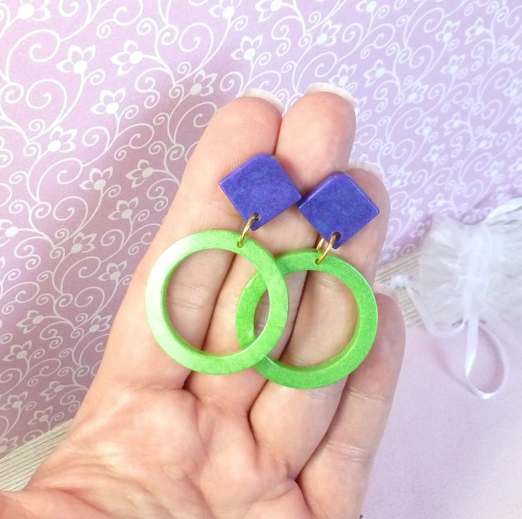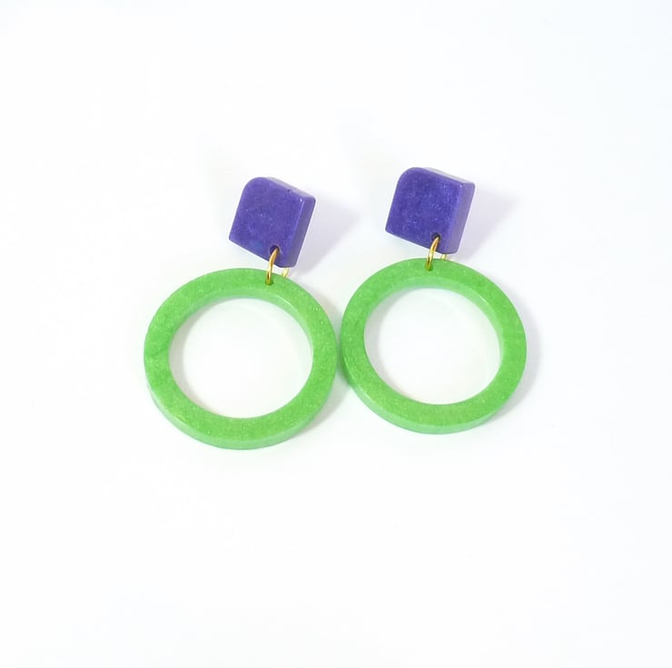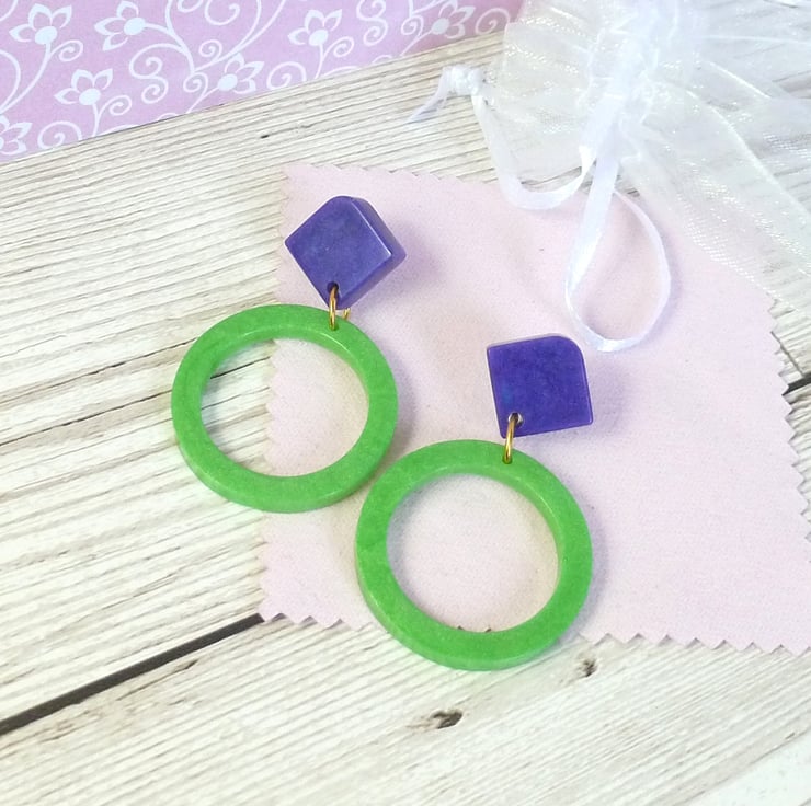 Bright green hoops and purple resin earrings, quirky colourful fun earrings
