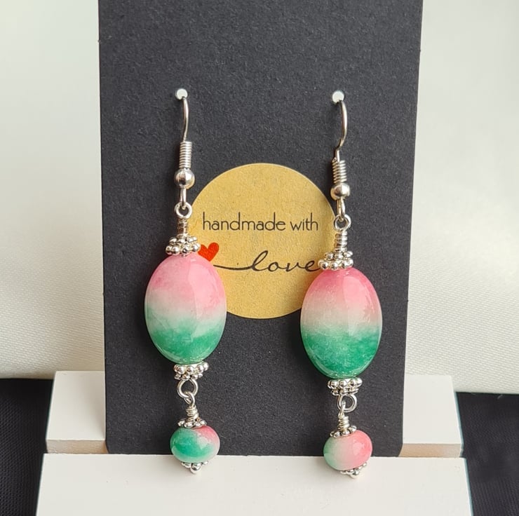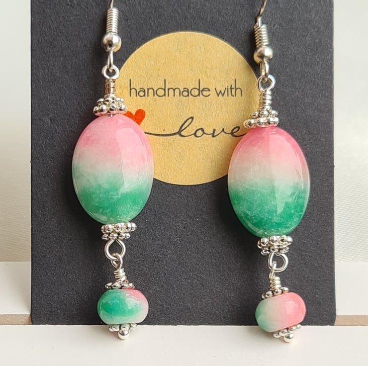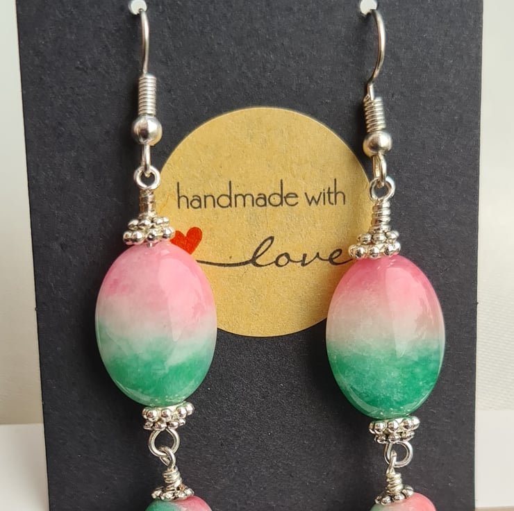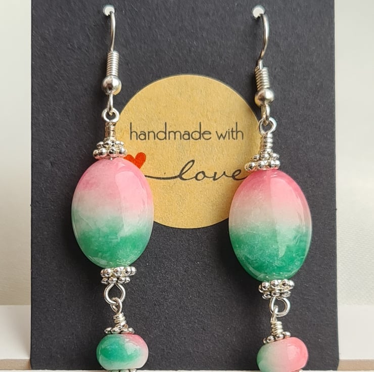 A lovely pair of colourful earrings with Watermelon Gemstone Oval Beads and small bead dangles. A gorgeous handmade gift in Pinks and Greens.