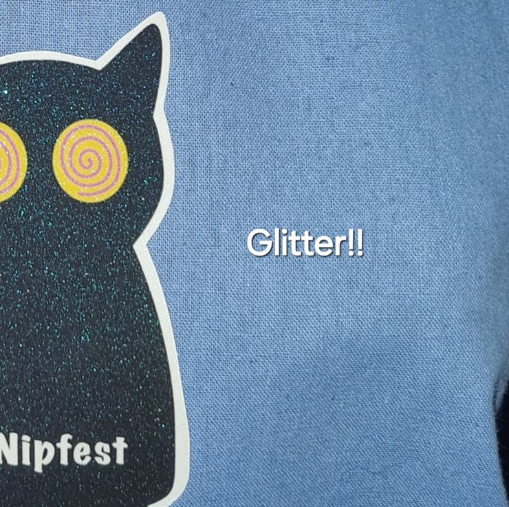 Fancy having the nippednup kitty ironed on to your fave t shirt or tote bag? Now you can! And it's glittery!
