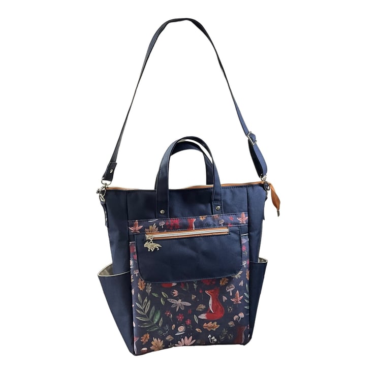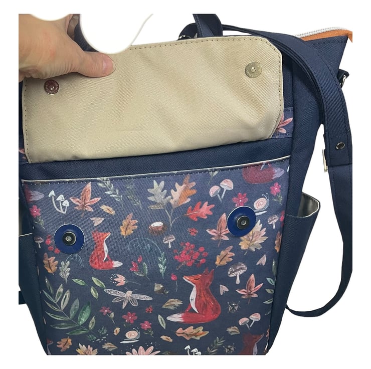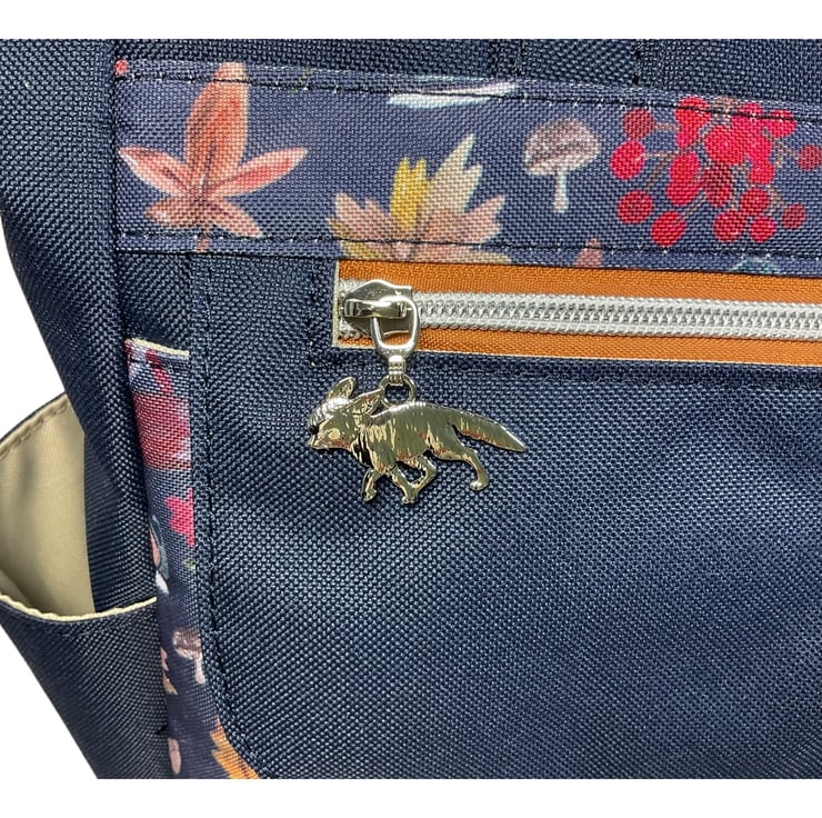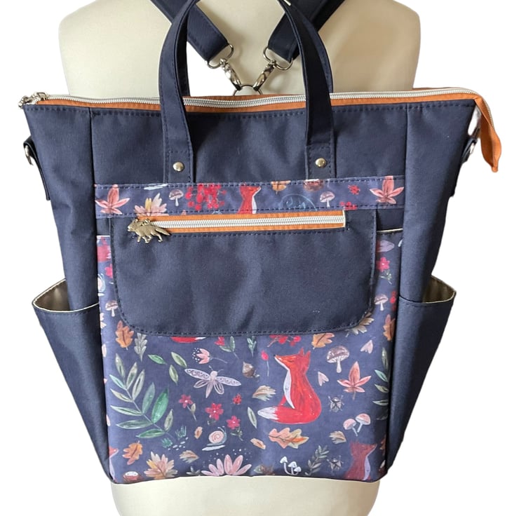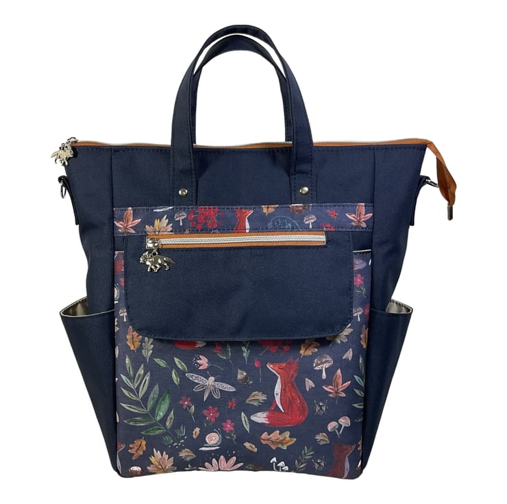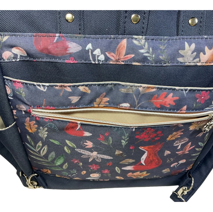 This Gorgeous large sized backpack is made entirely from waterproof and water resistant canvas. In dark navy with feature panels of cute foxes in a woodland scene. Fully lined in light stone.