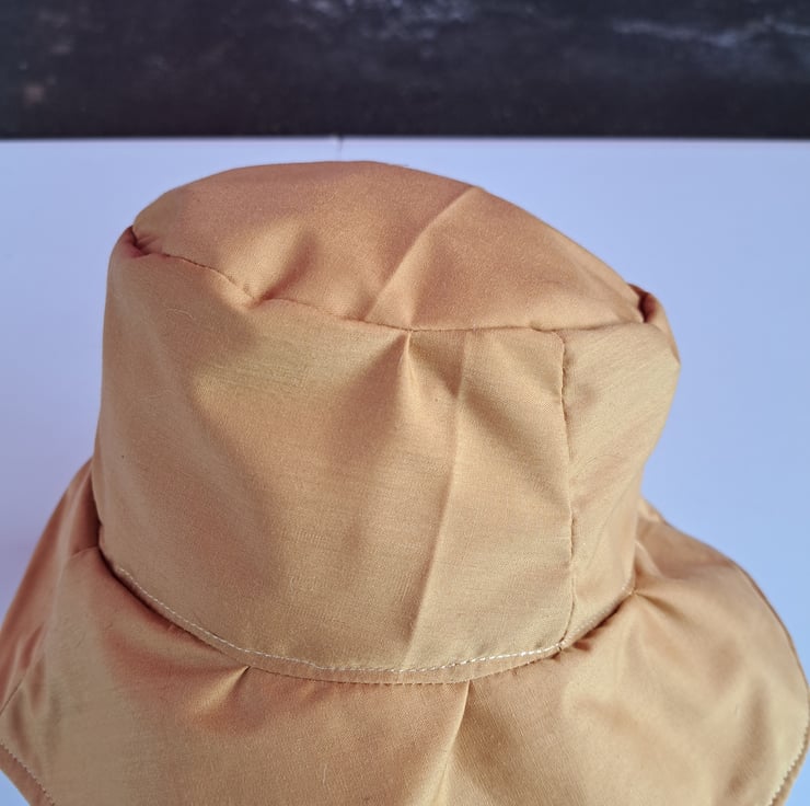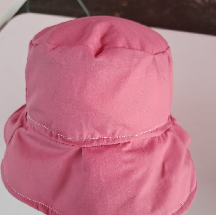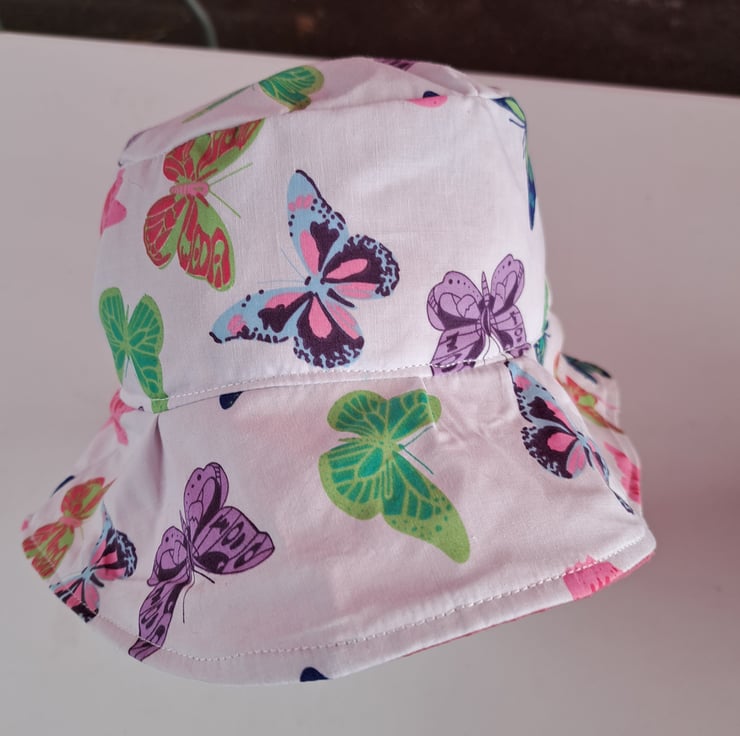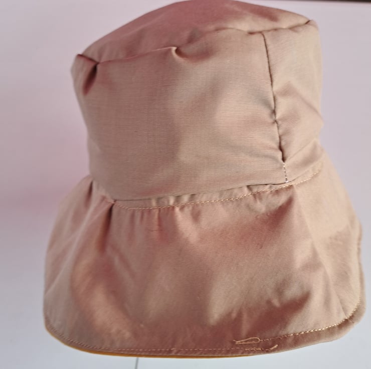 Men and ladies reversable bucket hats man's one is a mustard one side taupe the other side side , lady one is butterflies one side and plain pink the other side can be made in any colours