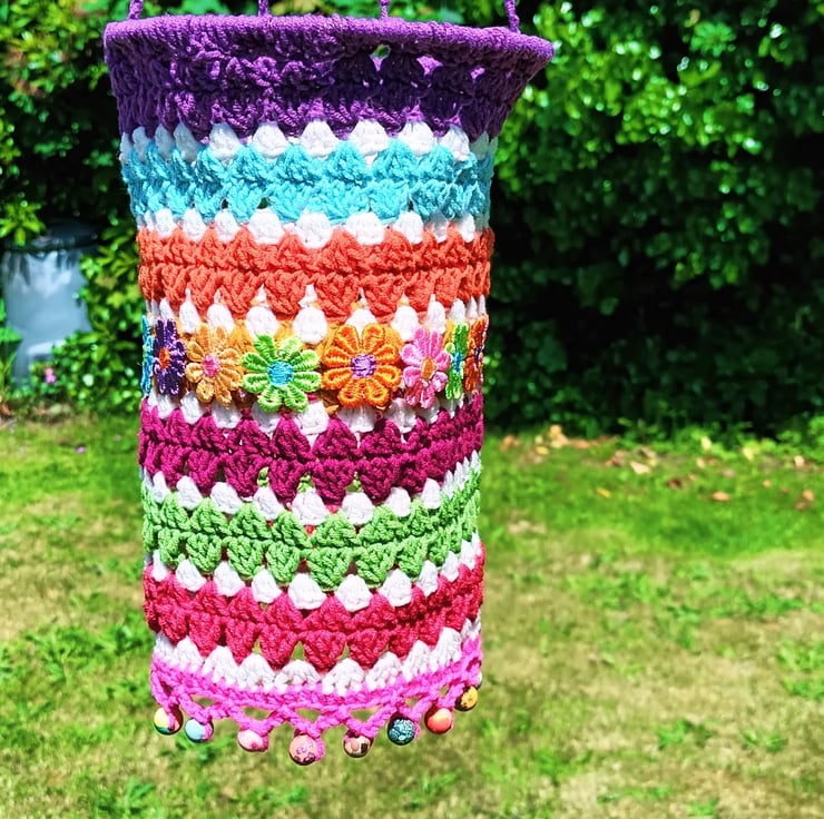 Beautiful crochet garden lantern. Add a pop of colour to your garden with this bright crochet lantern. Also looks lovely hanging inside at a window or used as a light shade.