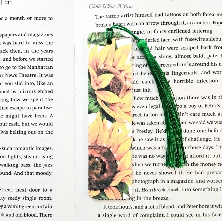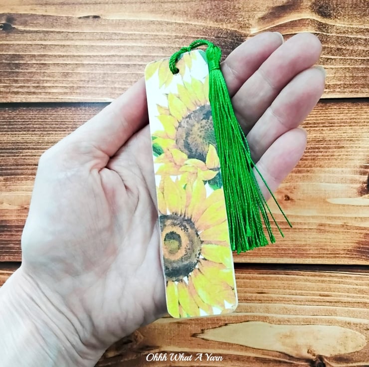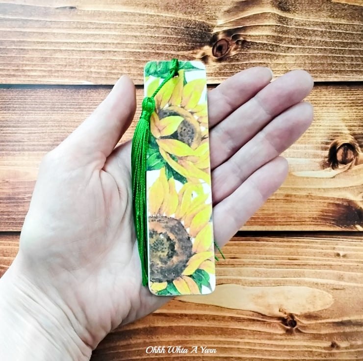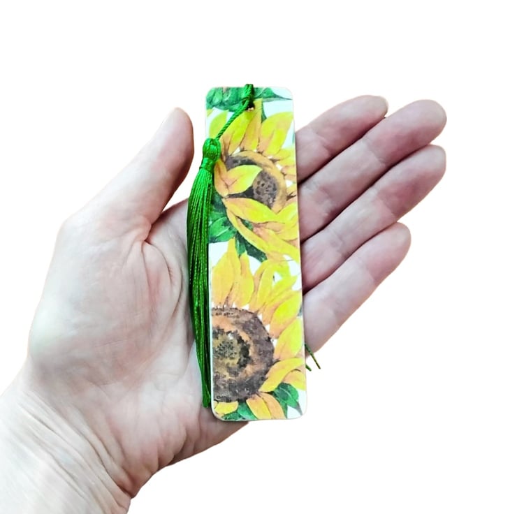 This pretty sunflower bookmark has been created using copyright free paper napkins on a wooden bookmark. It measures approximately 12cm by 3 cm. It is decorated on both sides with different sunflower designs.