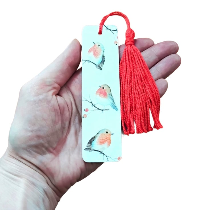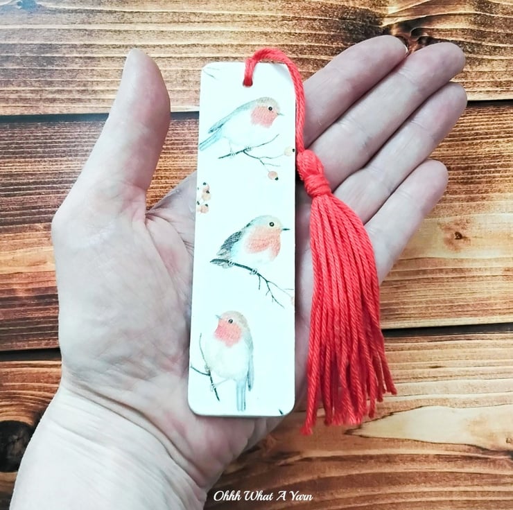 This gorgeous robin bookmark has been created using copyright free paper napkins on a wooden bookmark blank. It measures approximately 12cm by 3 cm. It is decorated on both sides with different robin designs.