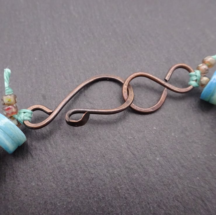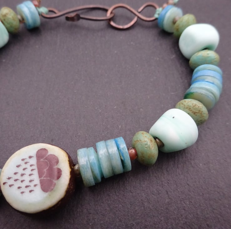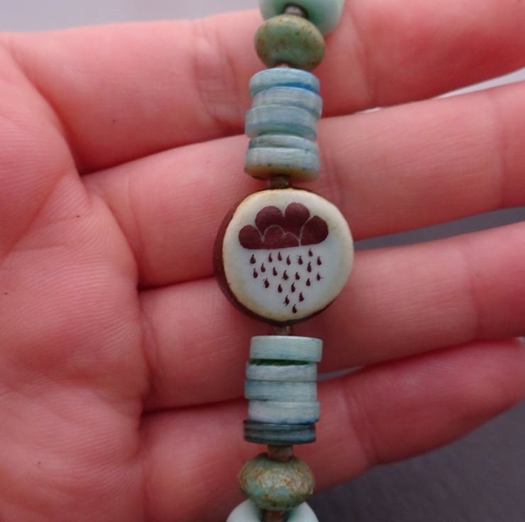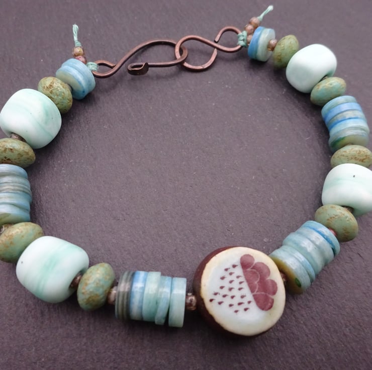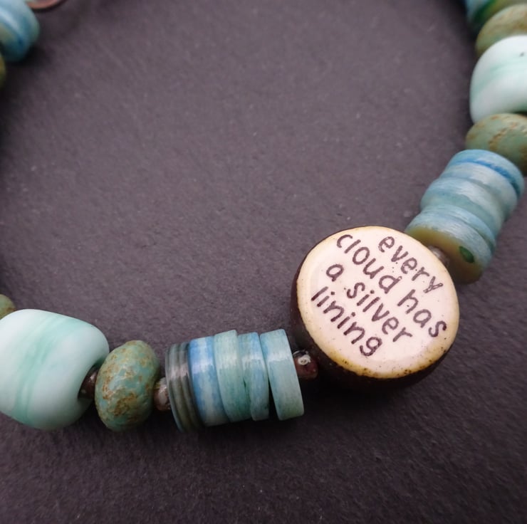 A bracelet made with Heishi shell and my green lampwork glass nugget beads. It features a ceramic focal bead with a raincloud on one side and the words 'every cloud has a silver lining' on the reverse.