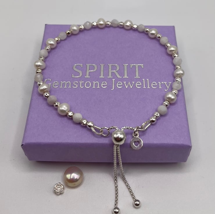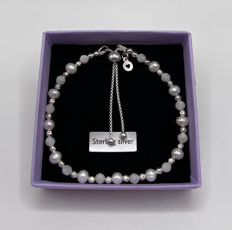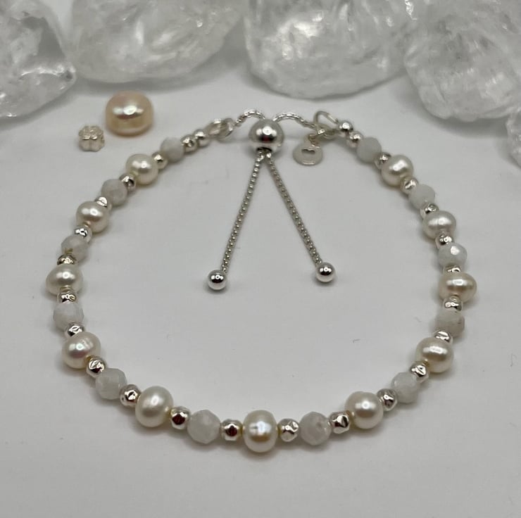 Hand made sterling silver adjustable bracelet with freshwater pearls and rainbow moonstones, both of which are birthstones for June .Total width of bracelet is 4mm so not to delicate or not too chunky. Ideal birthday gift for a June birthday or would also be nice as a wedding bracelet. The on trend adjustable slider clasp is easy to take on and off and can be adjusted to your required fit.