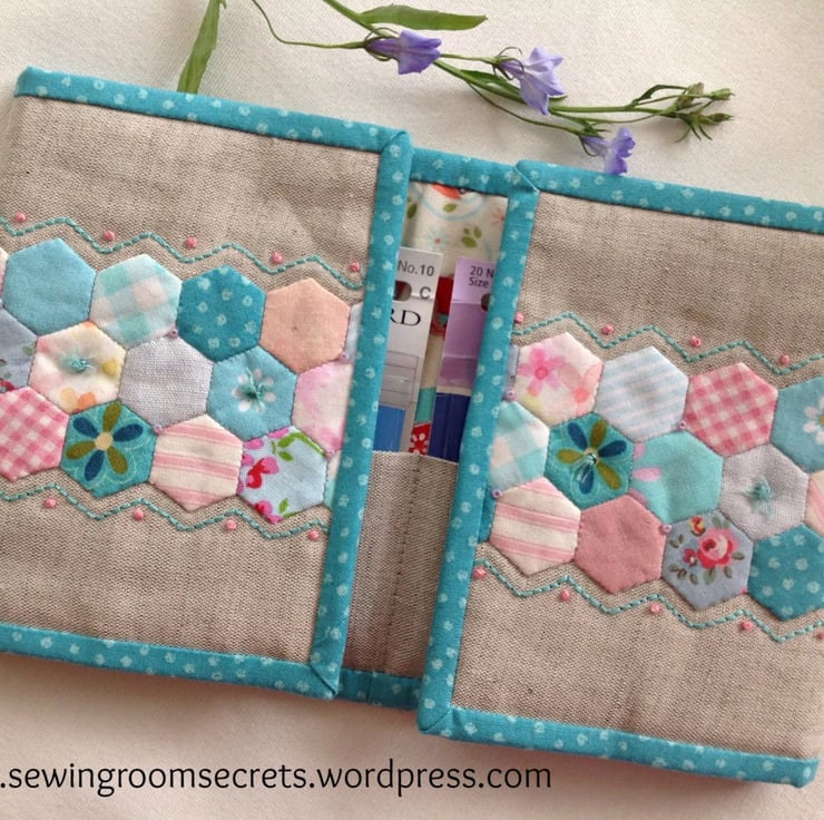 Read the 'story behind the stitches' of this pretty little needle caddy by copying this link into your browser https://sewingroomsecrets.wordpress.com/2013/08/12/little-hexie-needle-caddy/