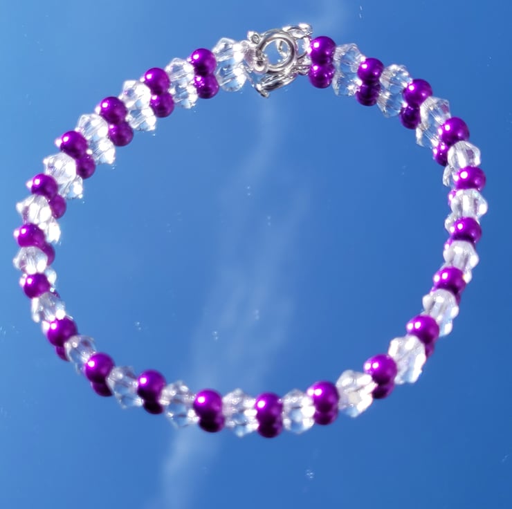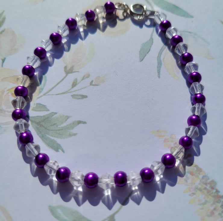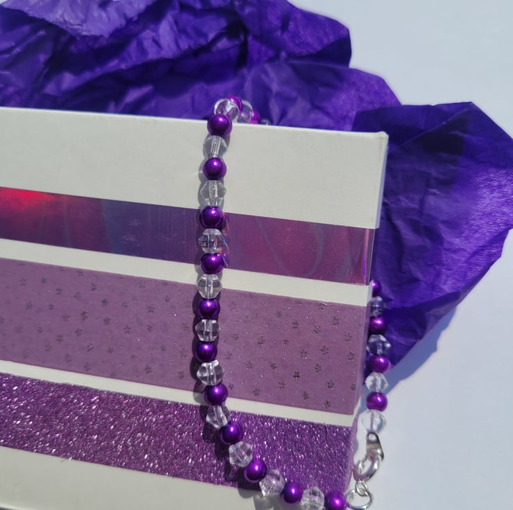 Round clear and metallic effect purple beads on nylon thread with silver plated clasp closure.