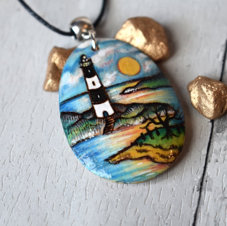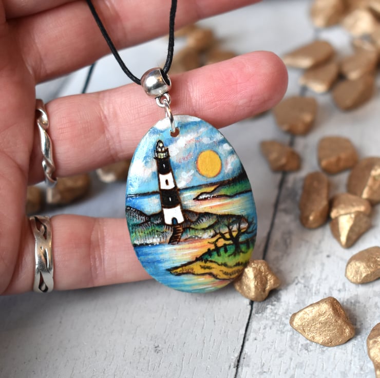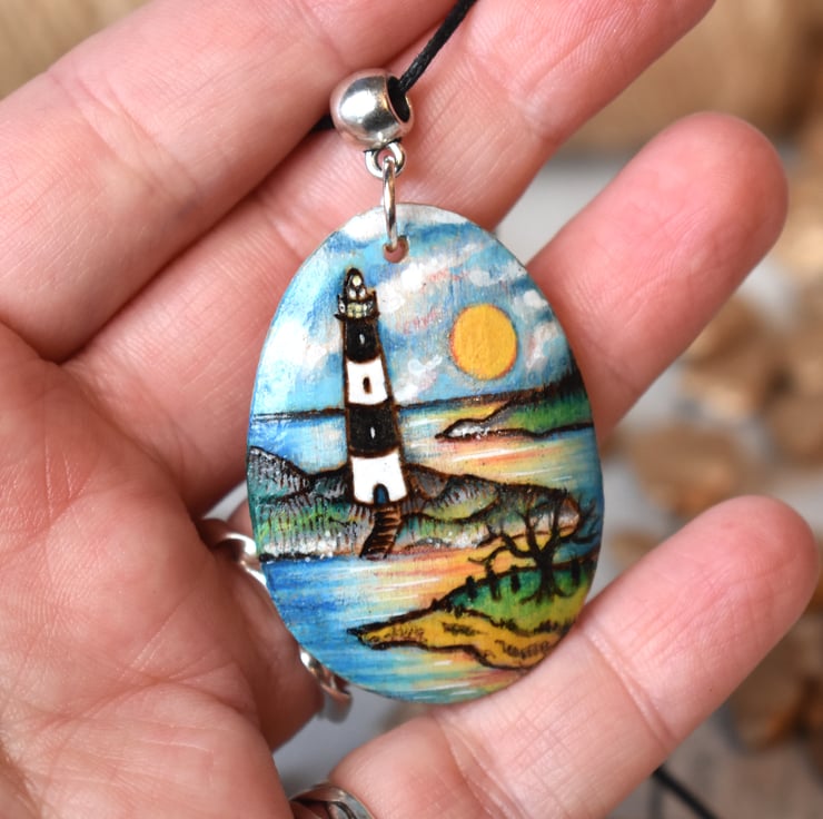 A coastal themed pendant, with a lighthouse and sun decending towards the horizon. Hand burned using pyrography and coloured with art pencils and inks.