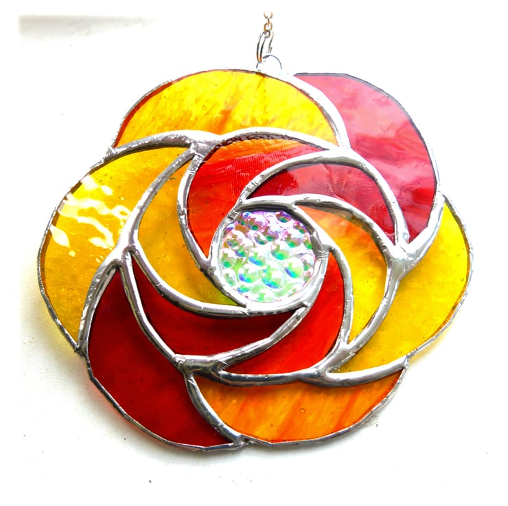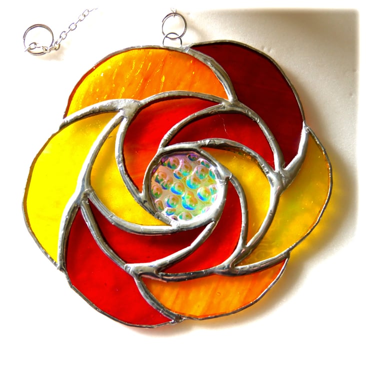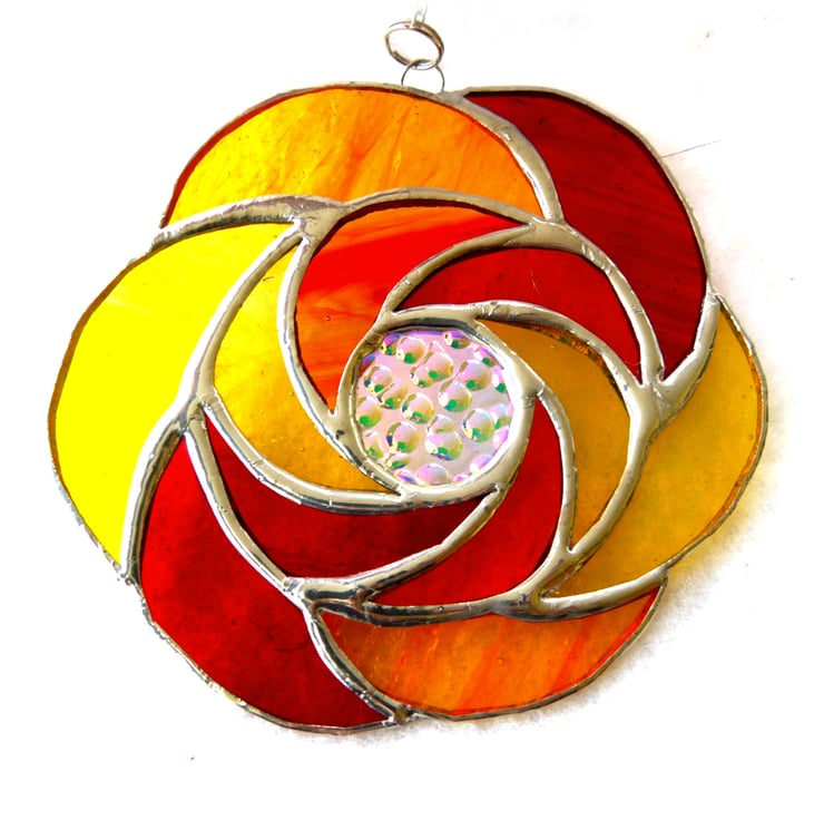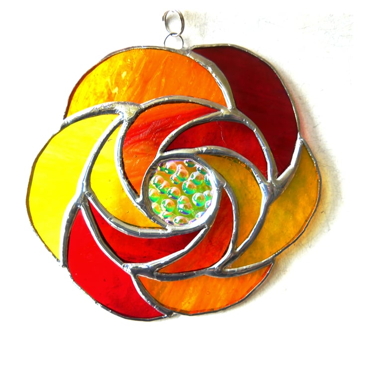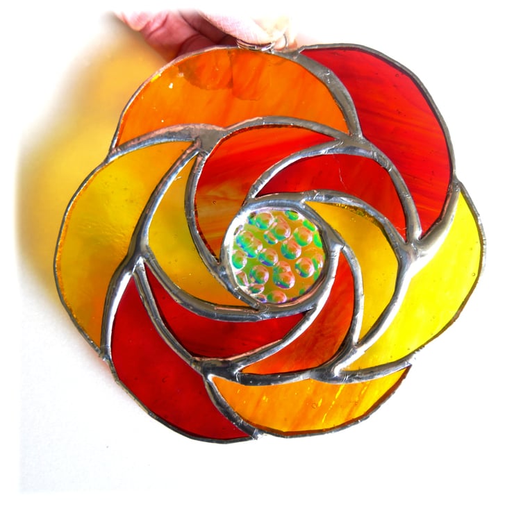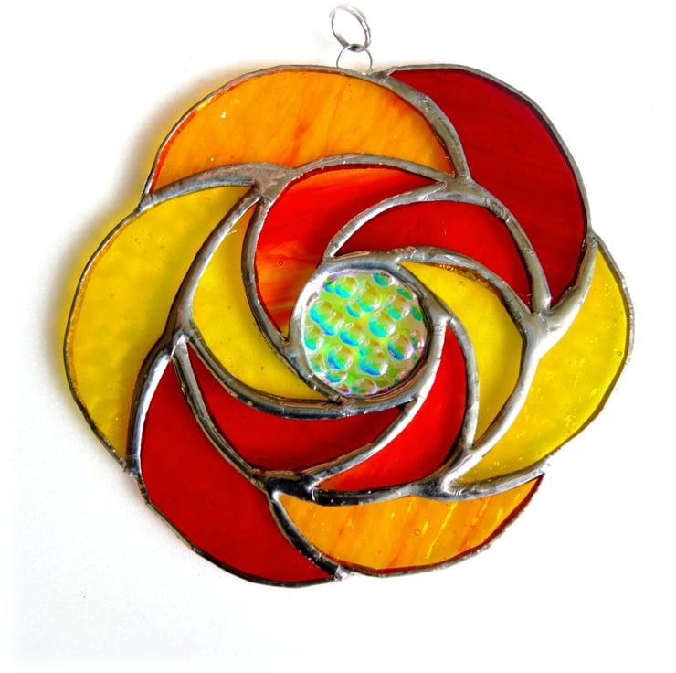 It is a ring of 6 hot sunshine coloured glass curls round a central circle of precious dichroic glass to give a fantastic sparkle and luxuriant touch to this suncatcher.. Round that is a second ring of 6 more curls.