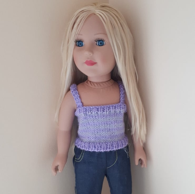 This hand knit PATTERN is for a camisole top for a Doll. To fit doll Height 46 cm or 18 inches. The camisole top is knitted in double knitting yarn using 3.25 mm and 4 mm knitting needles and is knit flat in one piece.
