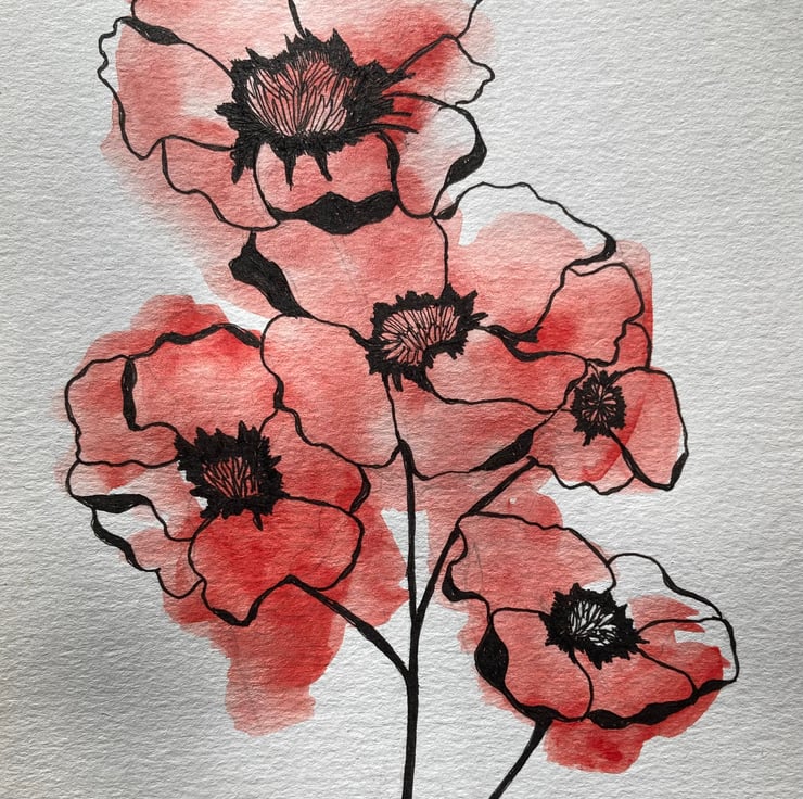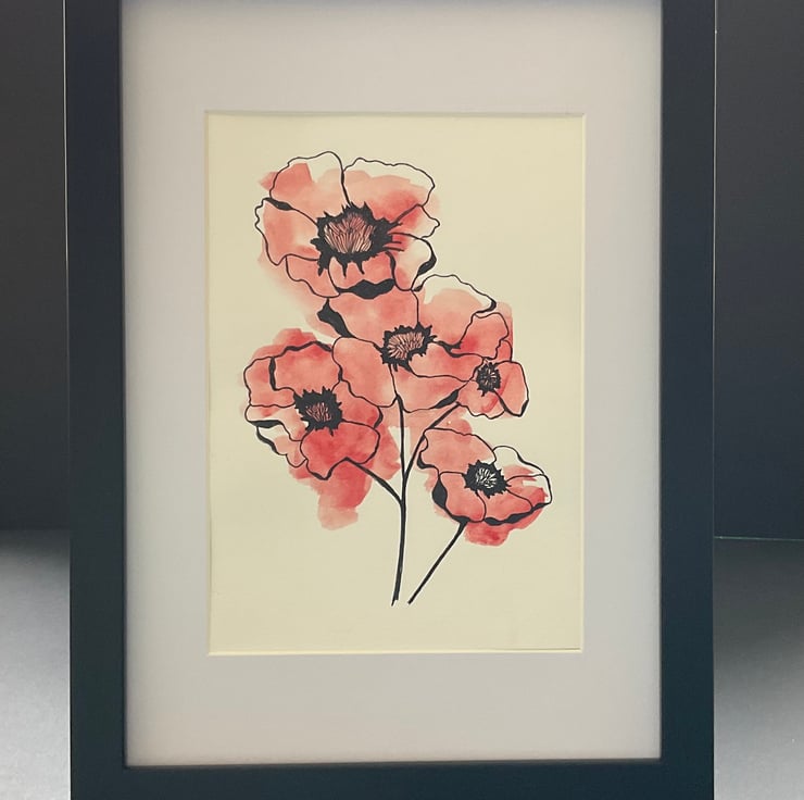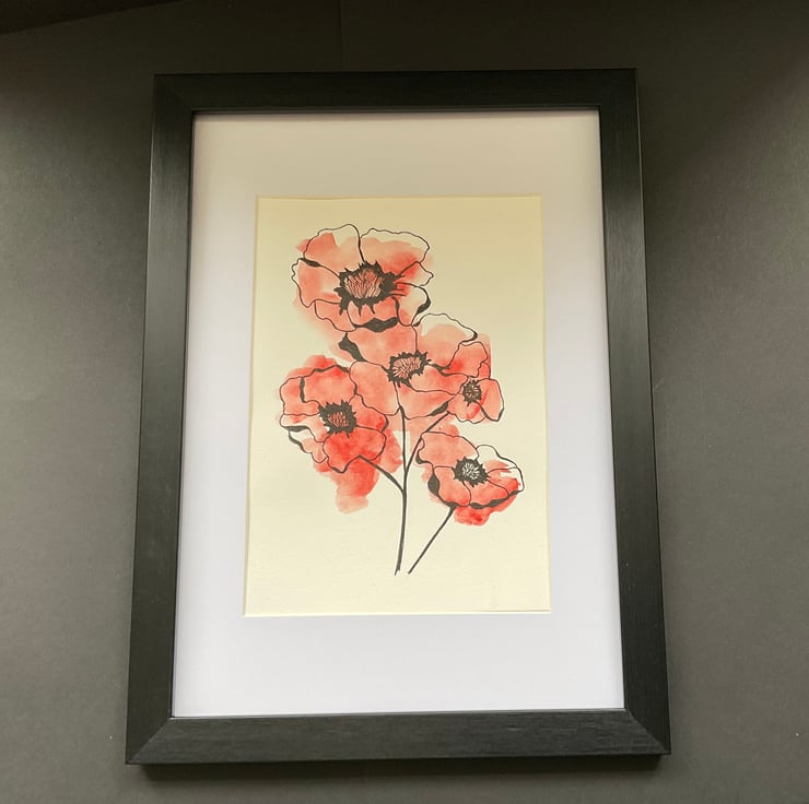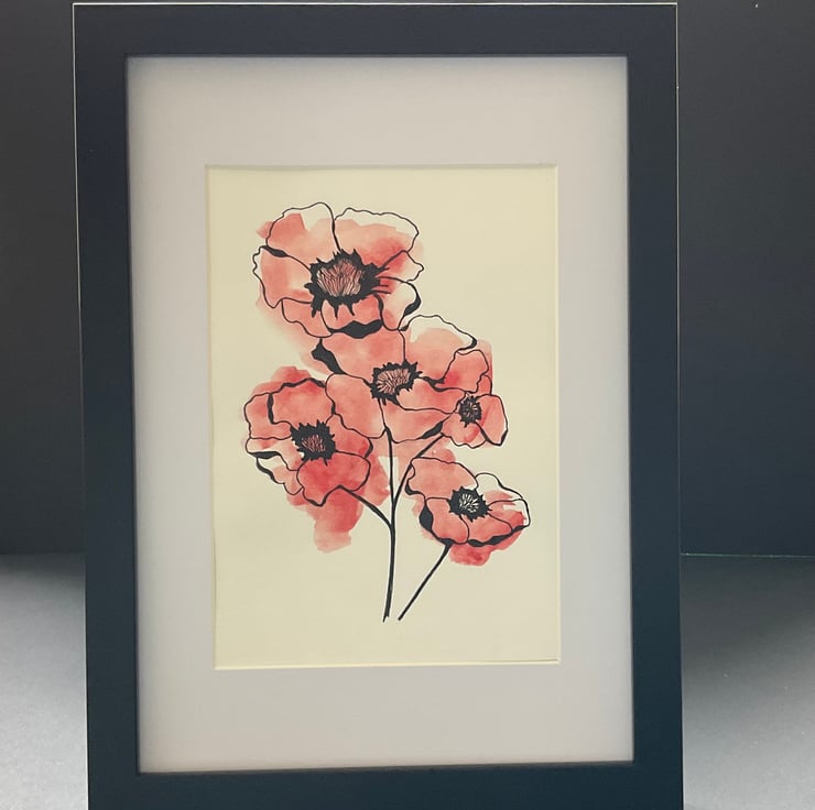 This painting depicts a modern poppy design .It is a one off original painting in watercolour and ink.