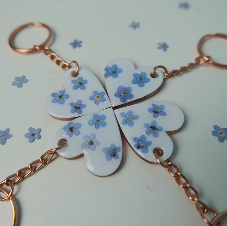 The back of the keyring has been painted white and a number of real, dried forget me nots have been placed and sealed in resin to preserve them forever. The number of forget me nots vary between keyrings due to their size (usually 3 or 4).