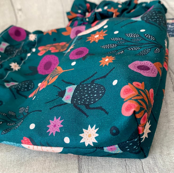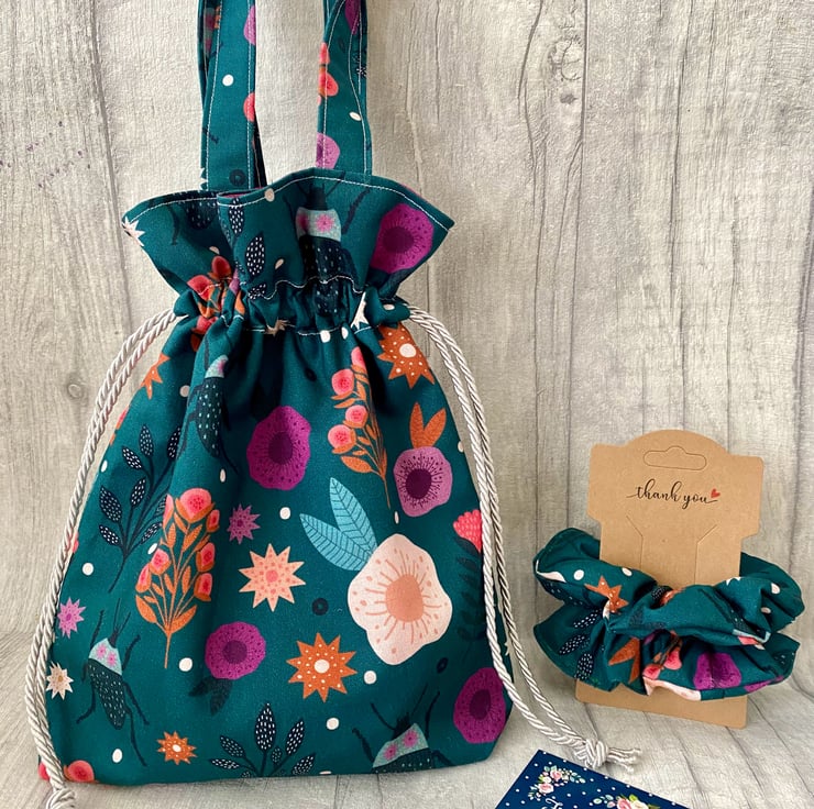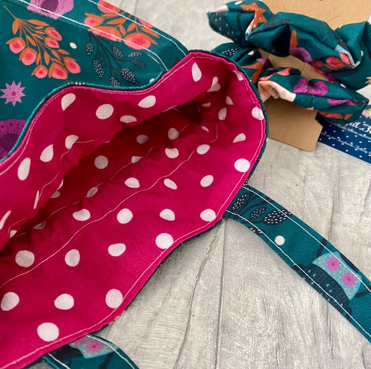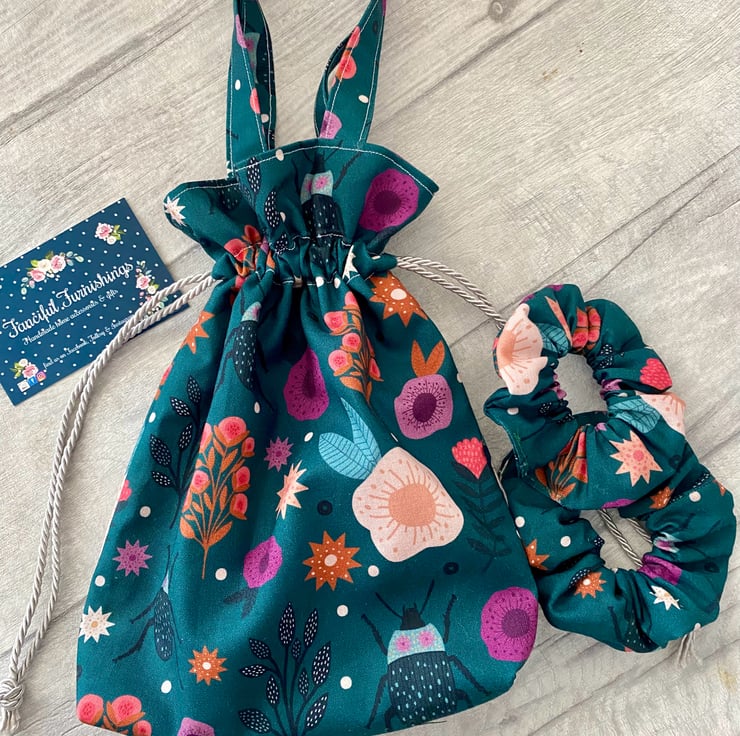 Beautiful girls dolly style bag with two matching scrunchies. The bag measures approximately 10 x 8” (excluding the handles), it’s fully lined and finished with a silver tie cord which works sets off the print on the fabric. This would make a beautiful gift for a young lady. I have lots of other beautiful fabrics available on request.