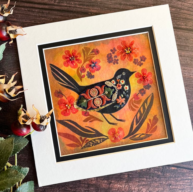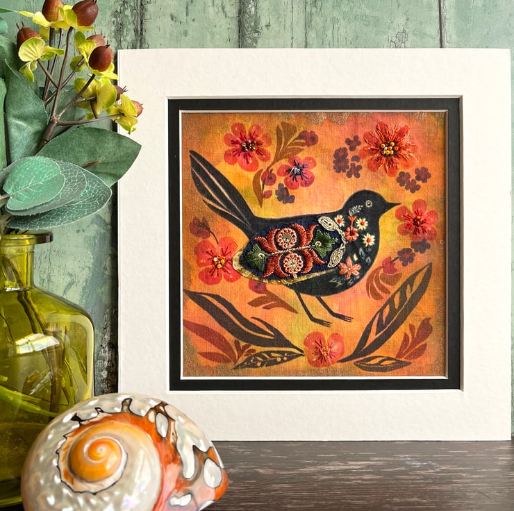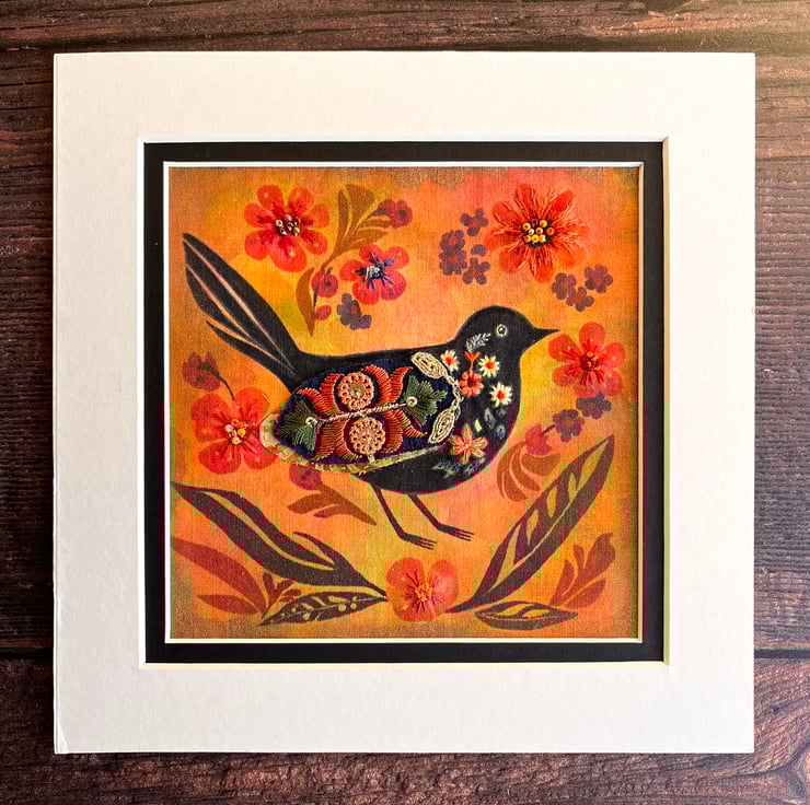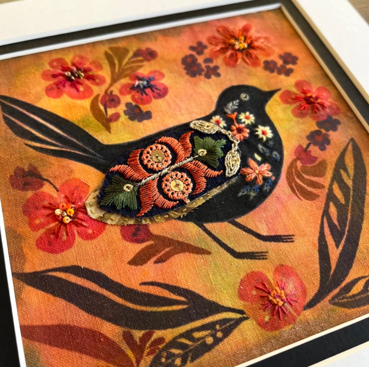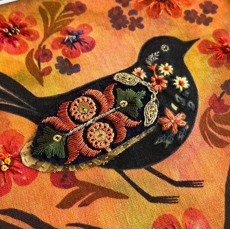 I've added embroidery to the tiny flowers on the bird's chest and embellished the larger flowers with embroidery threads and seed beads. The wing has been made from a layer of batik and a section of Indian embroidery.