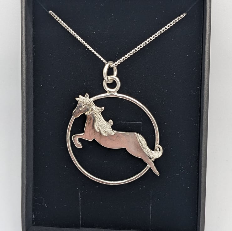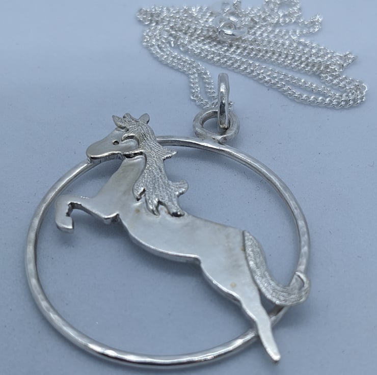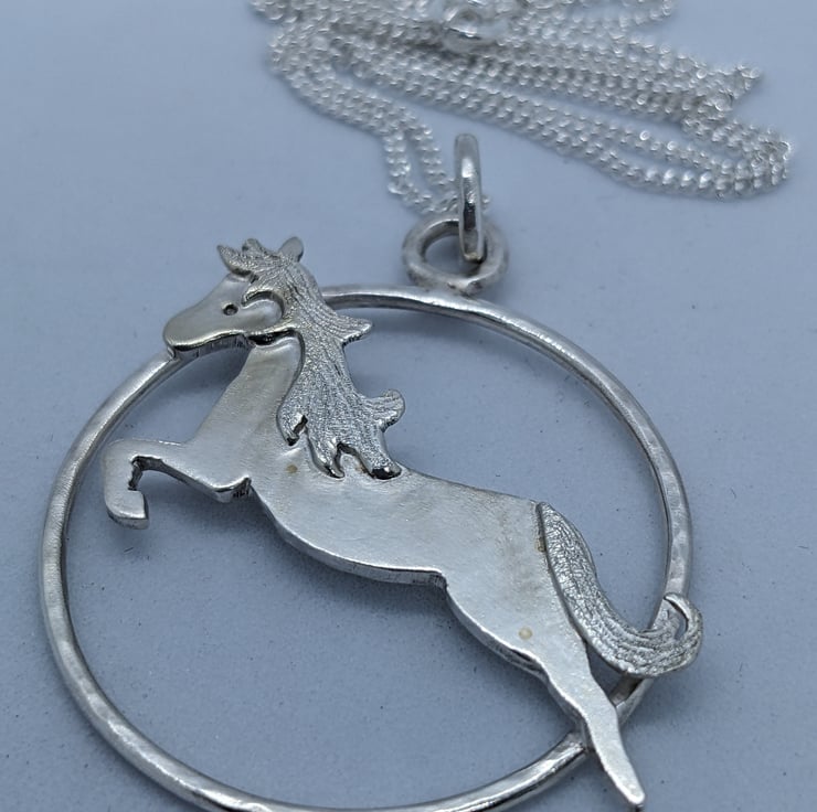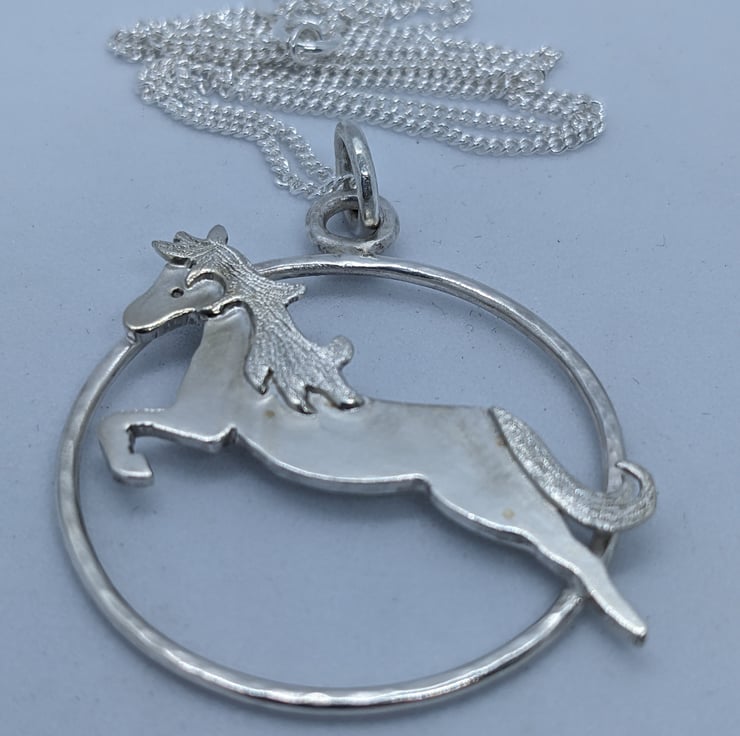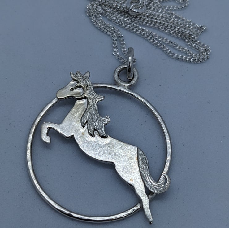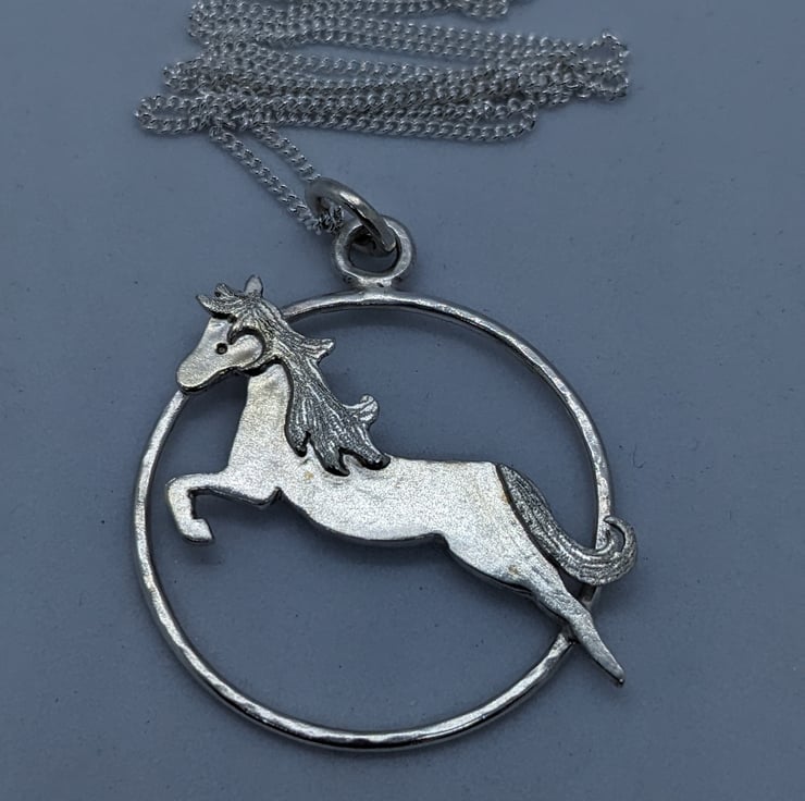 This sweet sterling silver horse pendant has been completely handmade to my original design. The pendant features a hammered ring with a diameter of approximately 3.5cm. The horse has been hand drawn and saw pierced. Its mane and tail have both been engraved to add texture and shine. A handmade jump ring is used to suspend the pendant from an 18 inch sterling silver curb chain. The pendant is hallmarked.