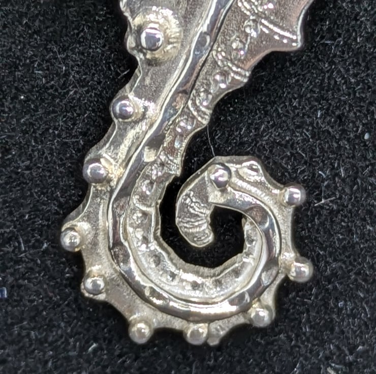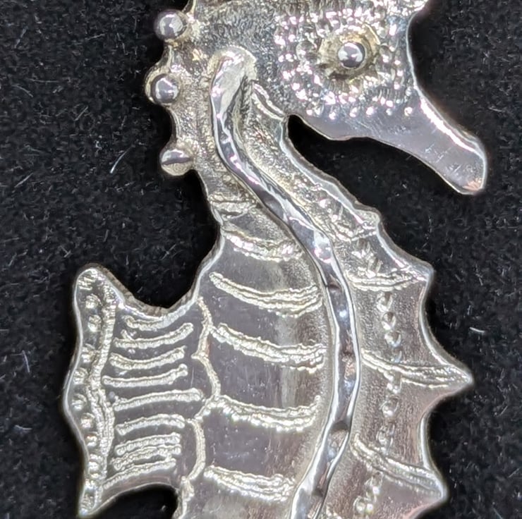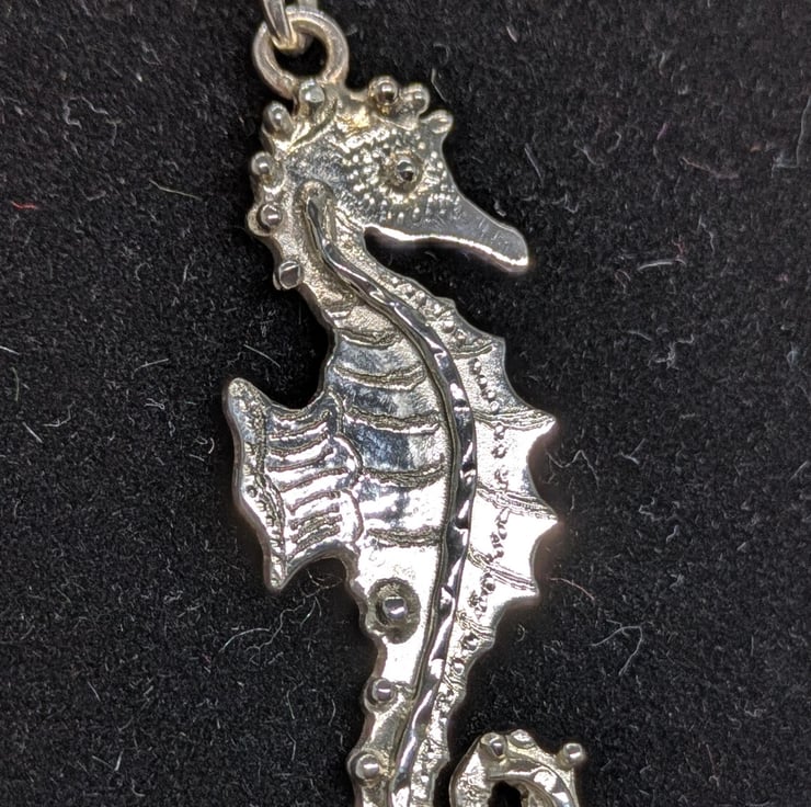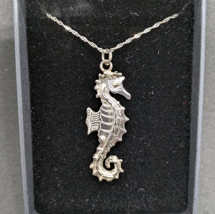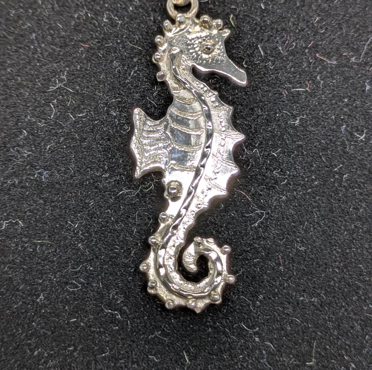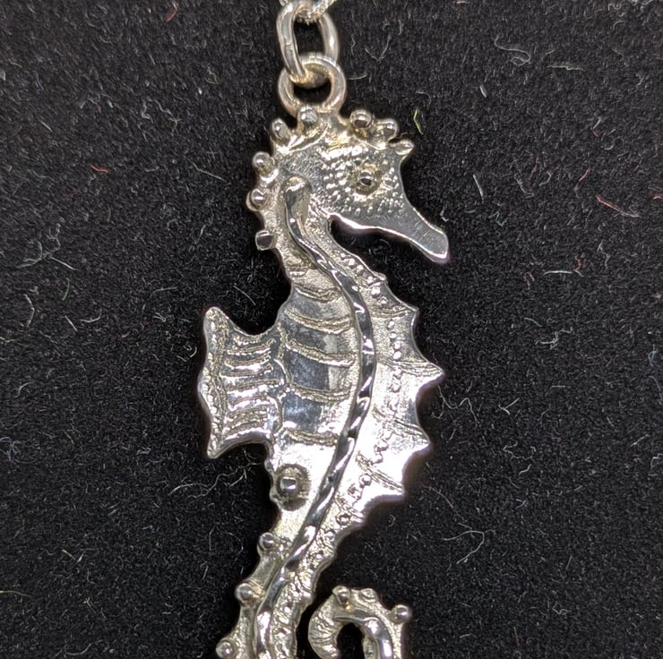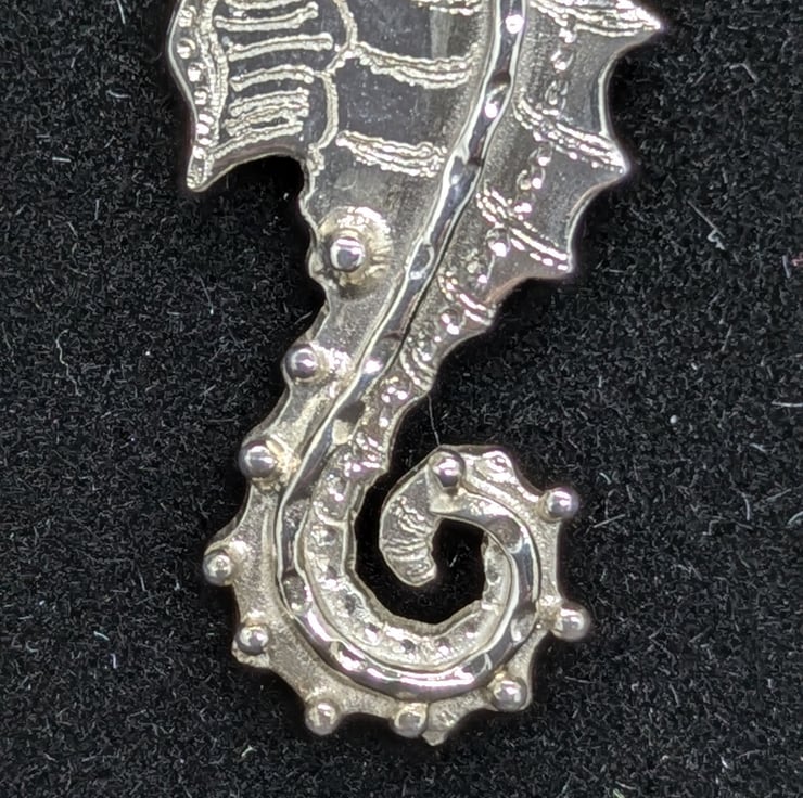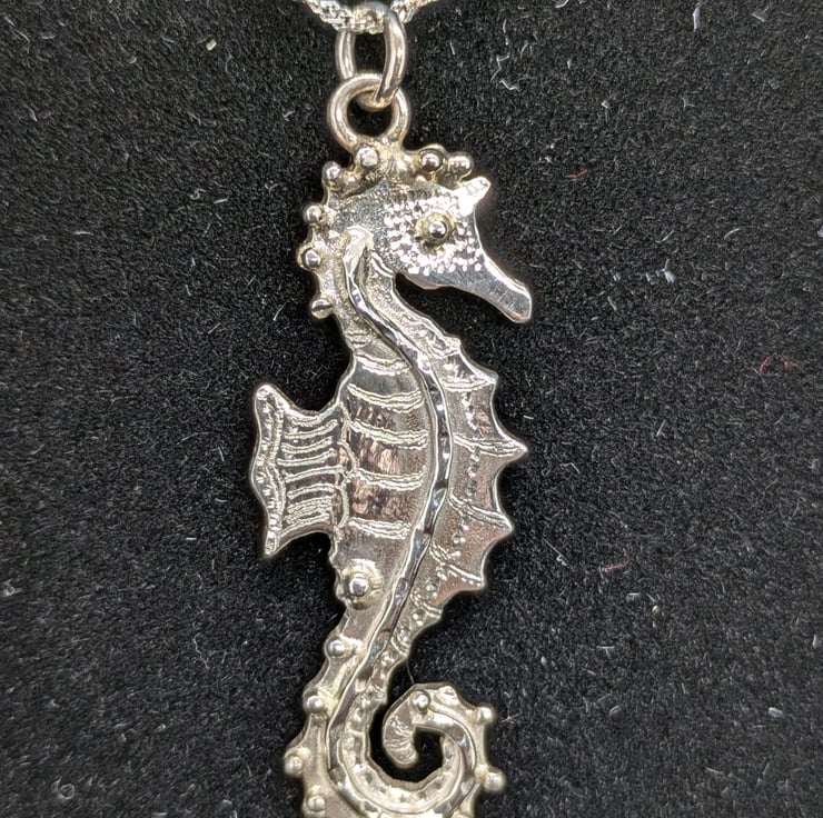 This pretty little seahorse pendant has been hand drawn and hand saw pierced. He measures approximately 3.8cm long and 1.3cm wide. He has been engraved to add texture and decorated using tiny, granulated silver balls and wire. The pendant hangs from an 18 inch sterling silver curb chain and is hallmarked.