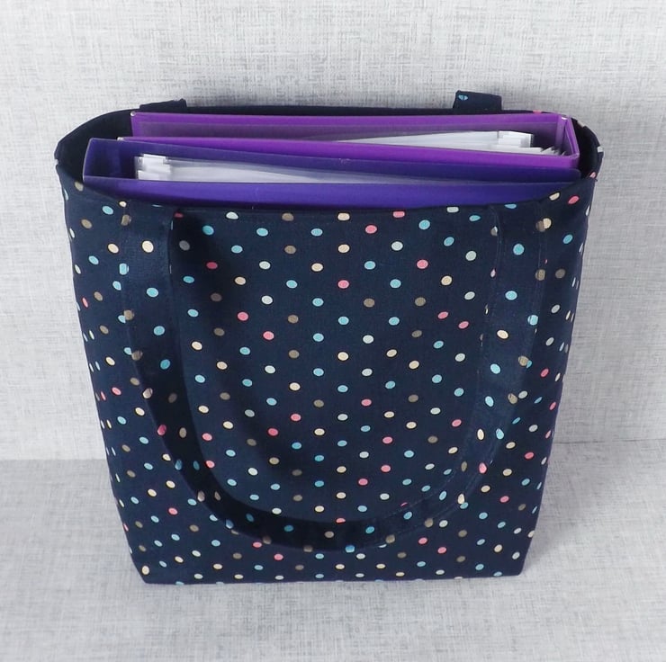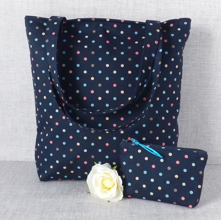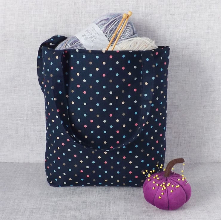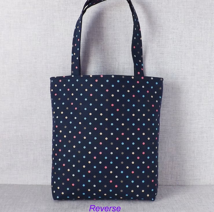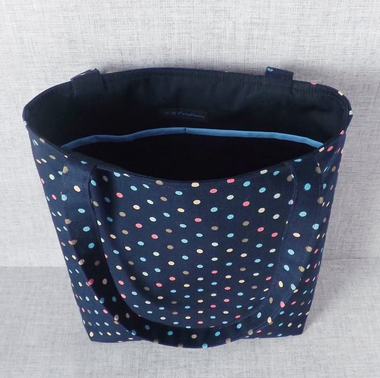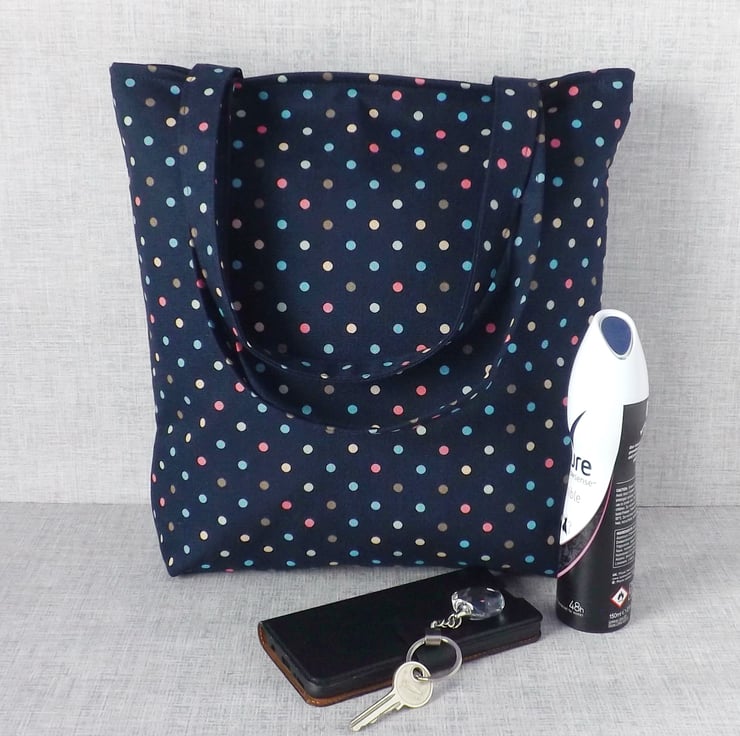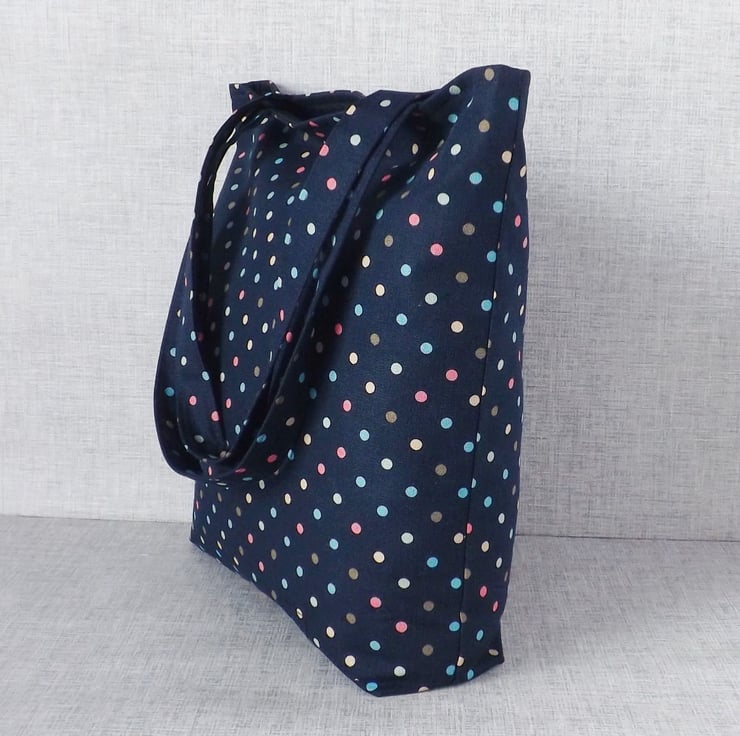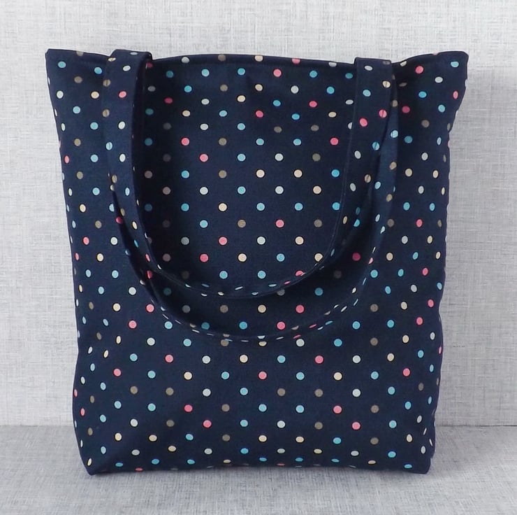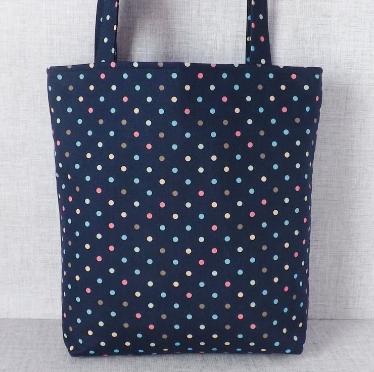 A medium sized strong tote bag, shopping bag, made from a navy blue cotton canvas with spots in shades of blue, pink, cream & brown..