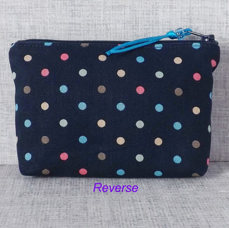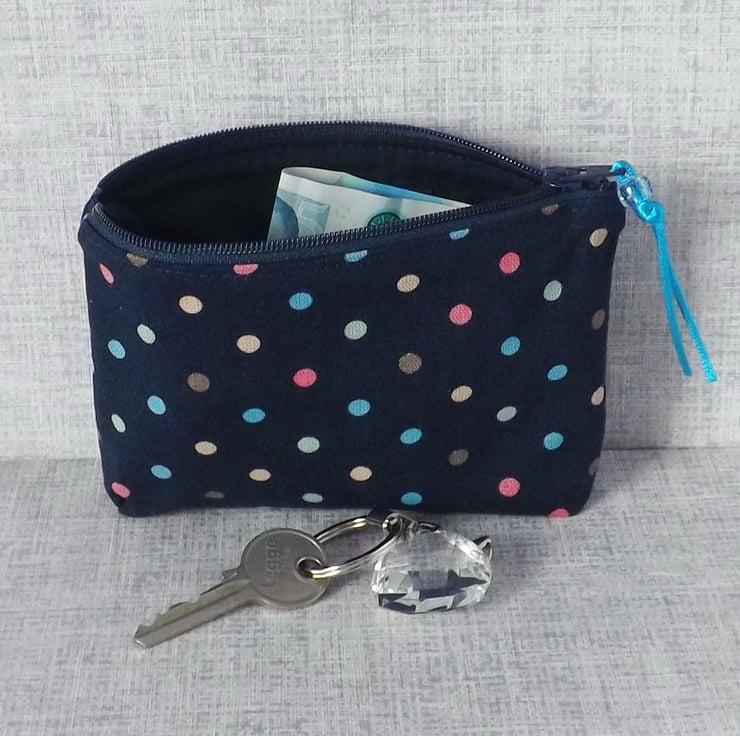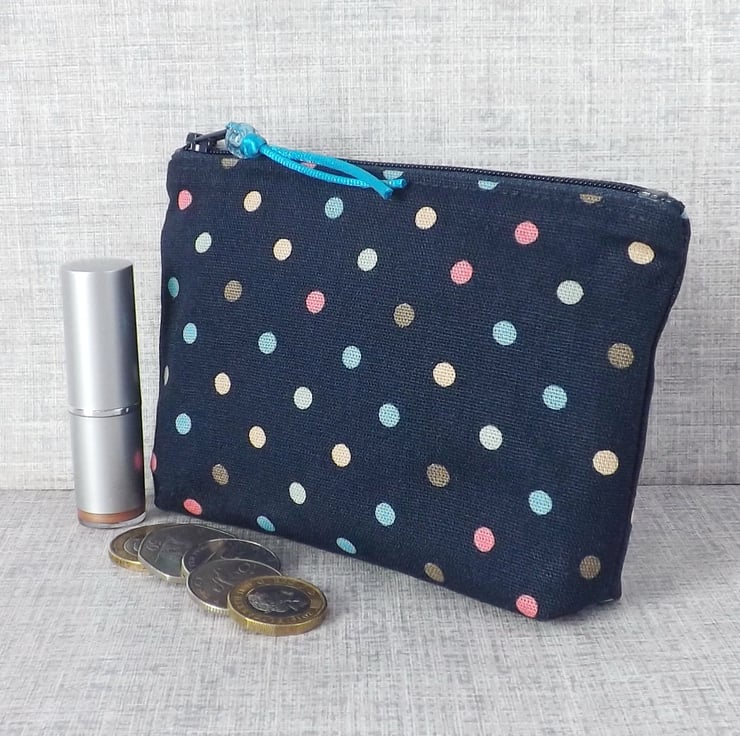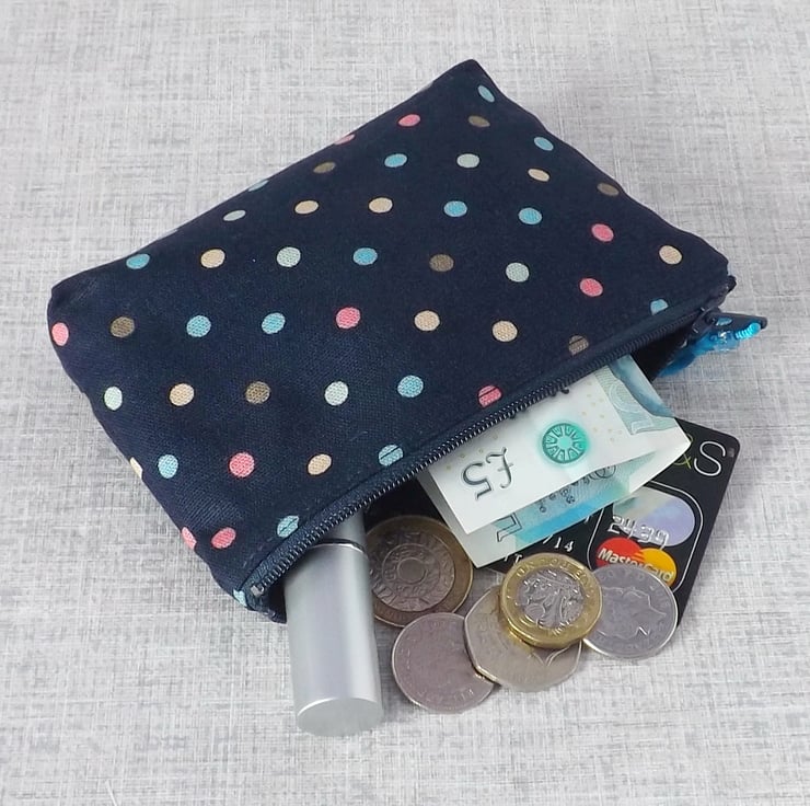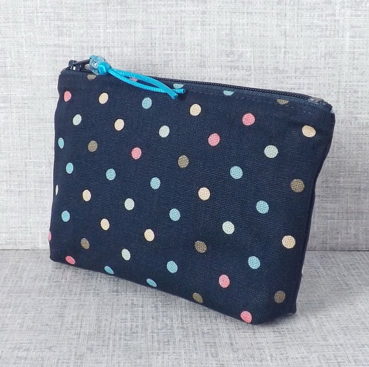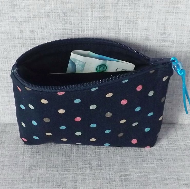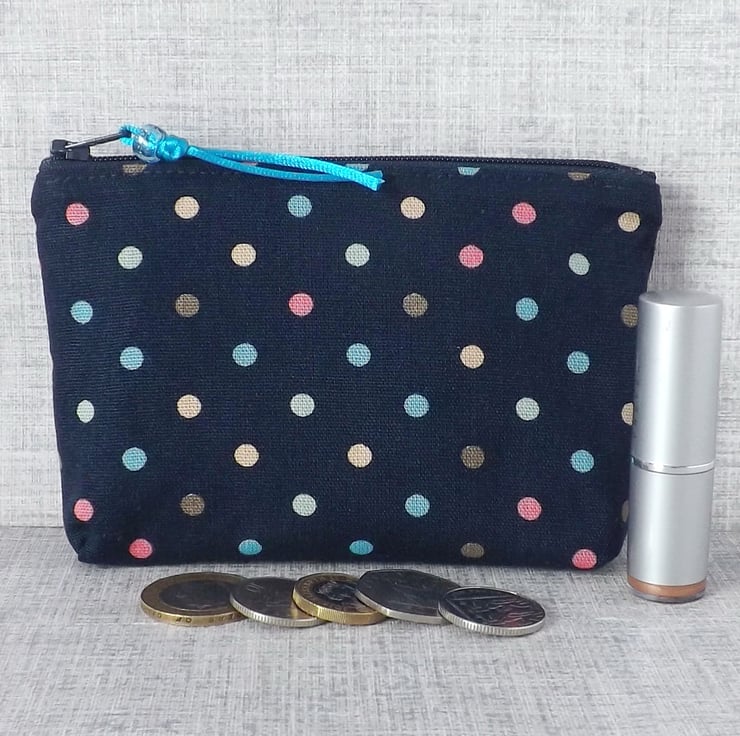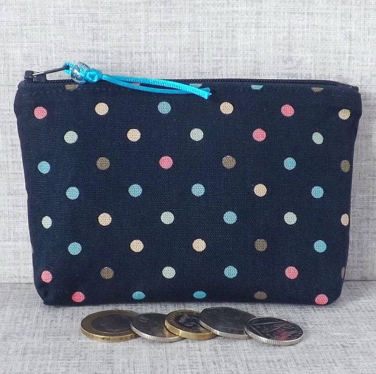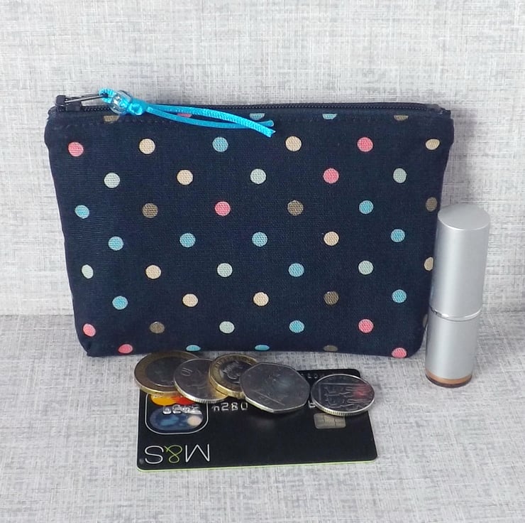 A medium size coin purse made from a navy blue cotton canvas fabric with spots in shades of blue, pink, cream & brown. The lining is a plain navy blue cotton fabric and there is a pocket inside for a credit/debit/store card or some notes.