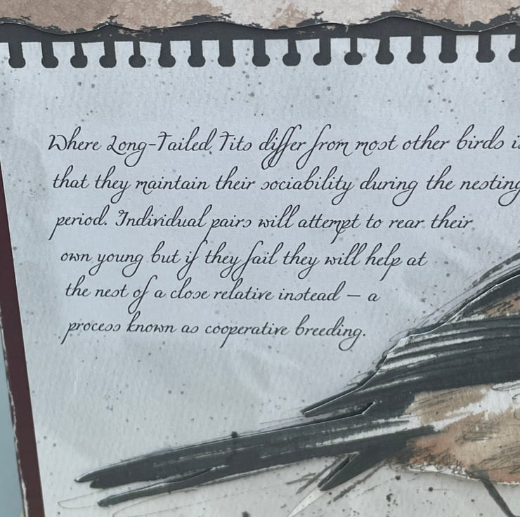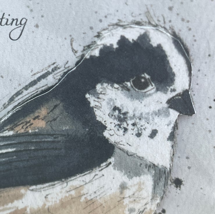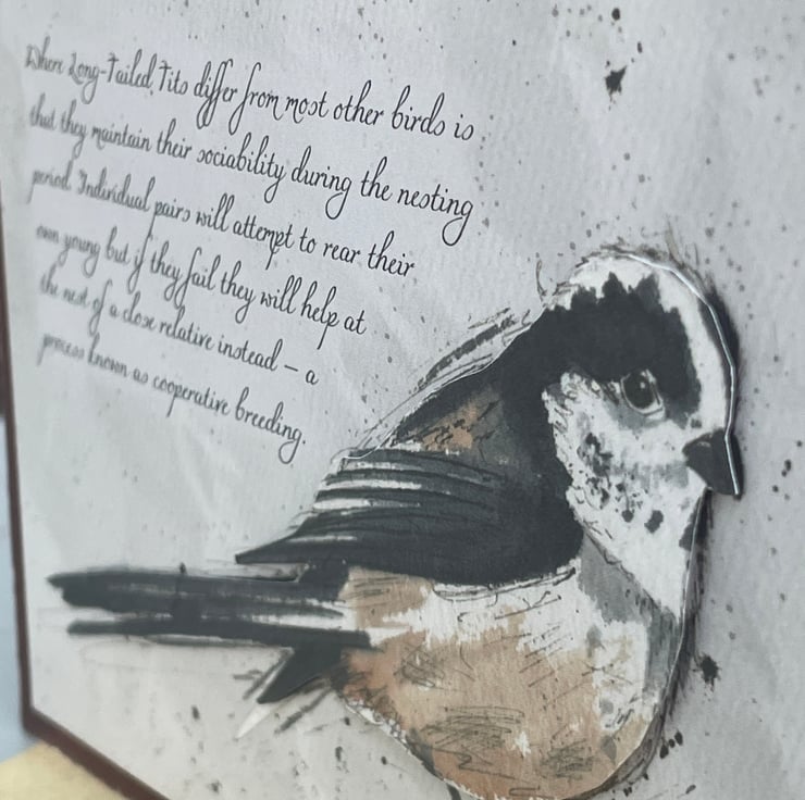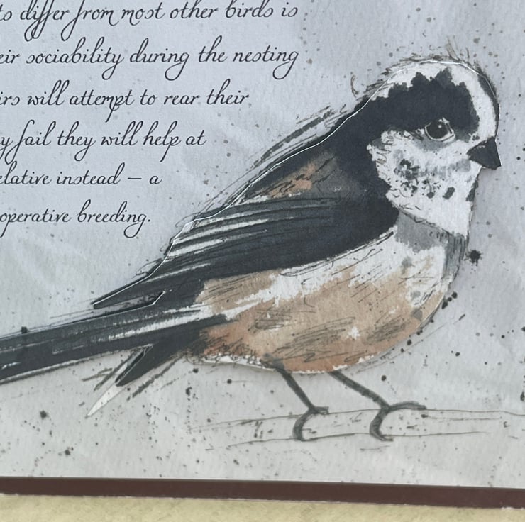 A lovely card for Father's day or a birthday. This 13x13cm card has a watercolour style image of a long tailed tit. There is a description about the habit of the bird on a splattered background, it is styled in a distressed way and is set on a background of distressed brown card. The design is layered to give it dimension. The card has no other greeting inside or out so can be used for many occasions but can be customized by adding a greeting. All you need to do is ask when ordering the card. It comes with a handmade envelope.
