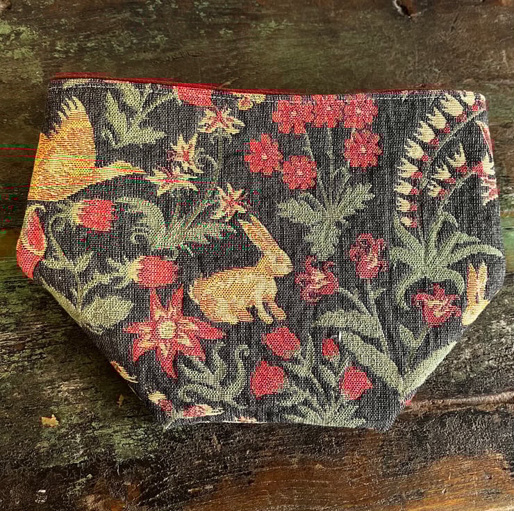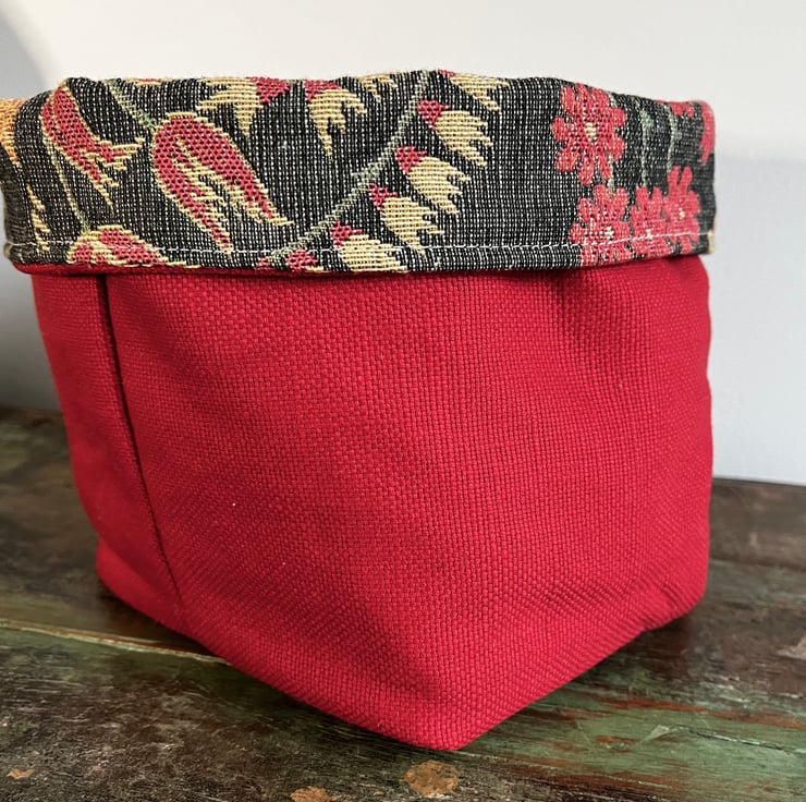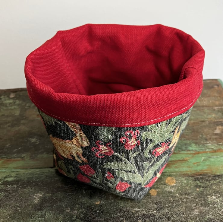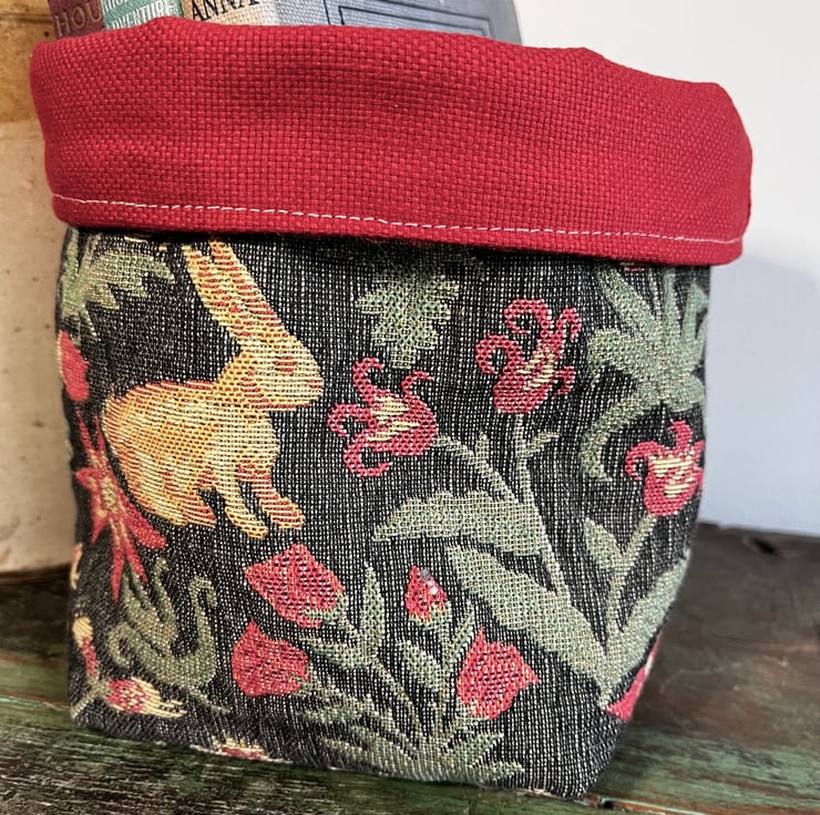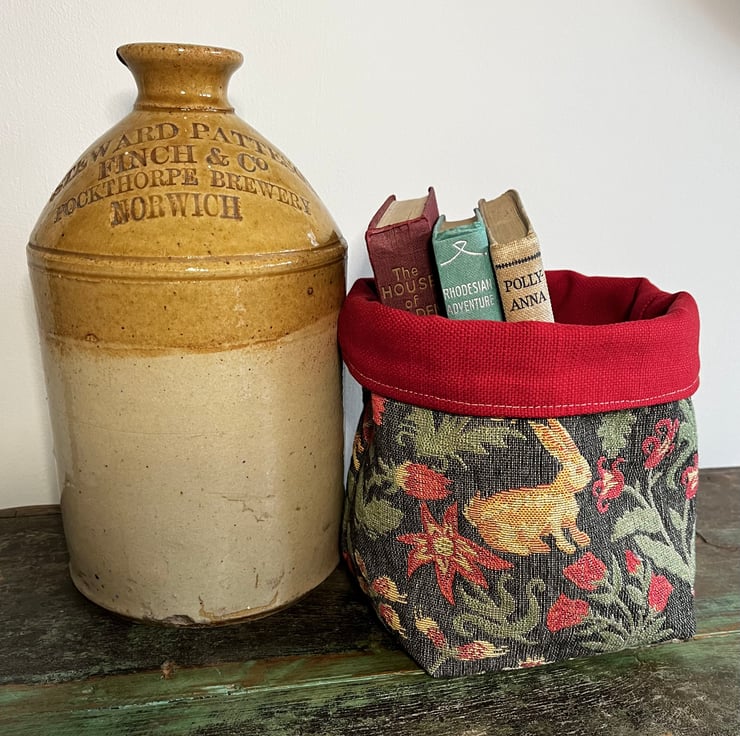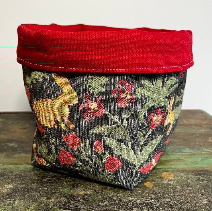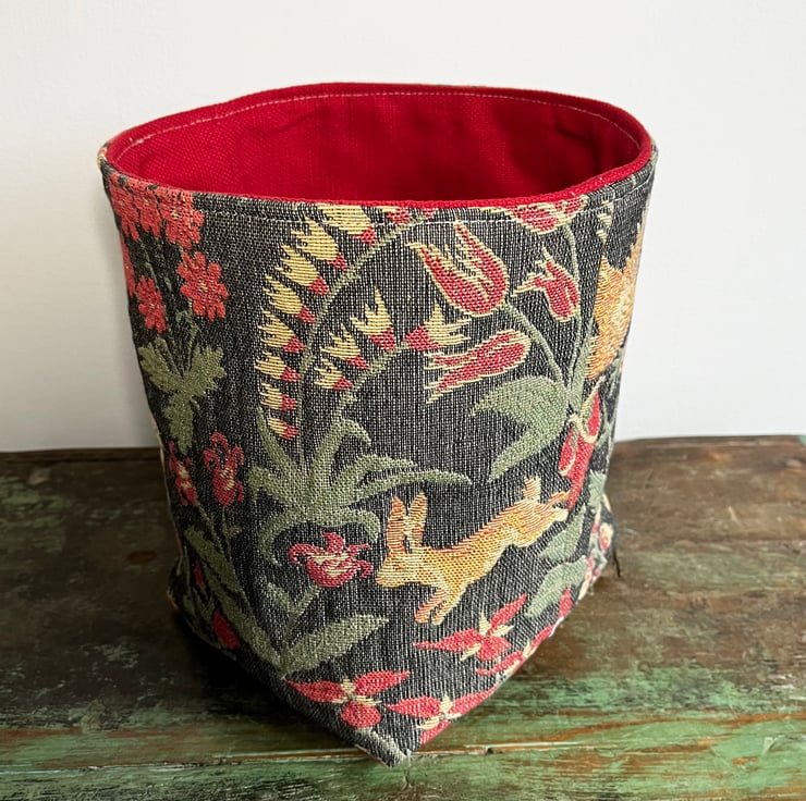 Reversible fabric storage basket made from reclaimed tapestry fabric from a door curtain with rabbits leaping across a floral background and thick red cotton. It can be used with a turn-down to make the most of the contrasting fabrics.