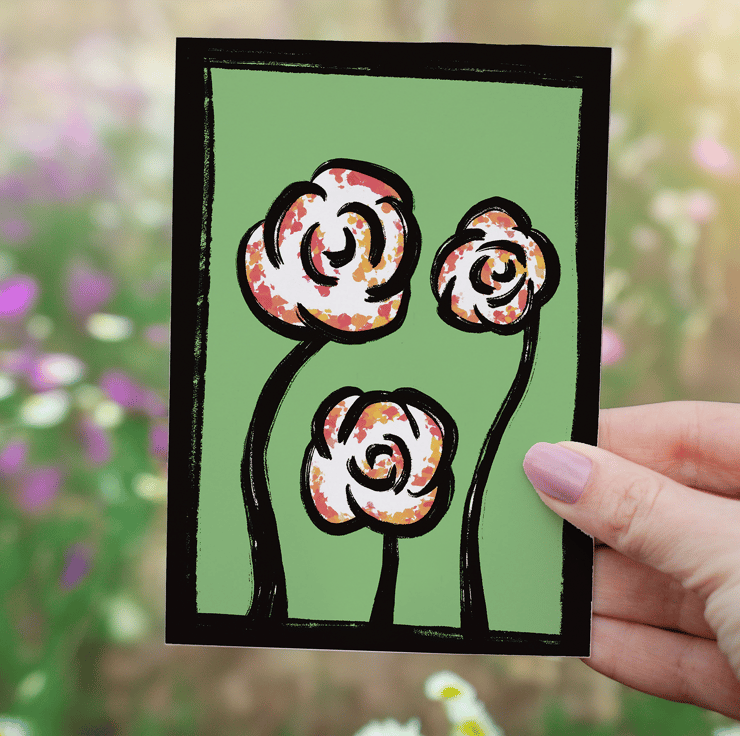 These are stylised roses on a green background with a black, inky border. A pretty card suitable for most occasions! This is part of a selection of flower-themed cards in my store.